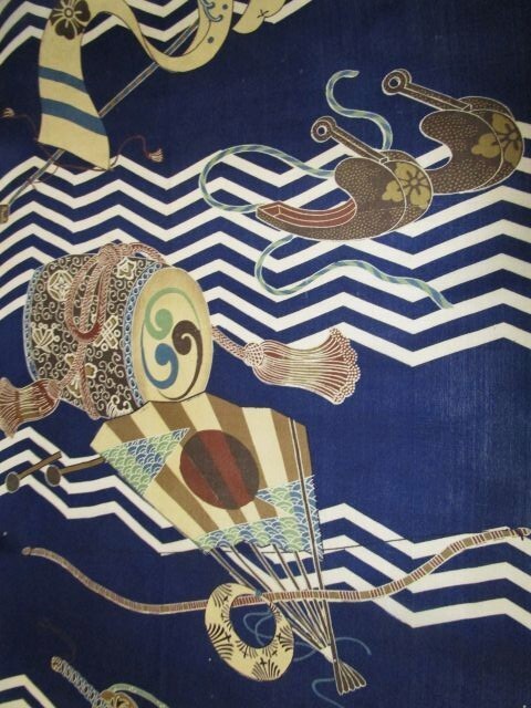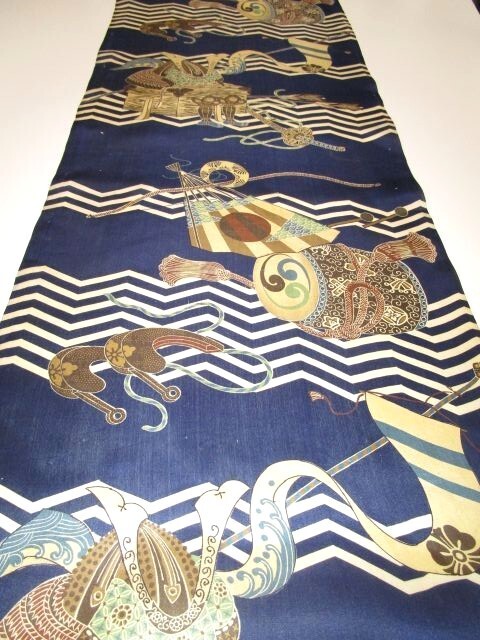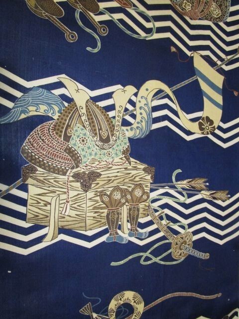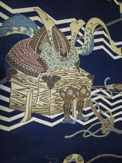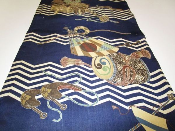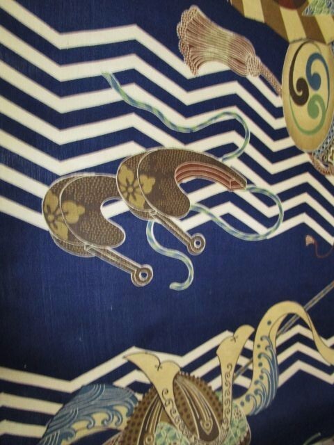 男6-50★戦国*鎧兜*刀*弓矢*扇*幟*鞍*太鼓*正絹*古布はぎれ★一閑張り/掛軸/襖絵/屏風絵/アンティーク