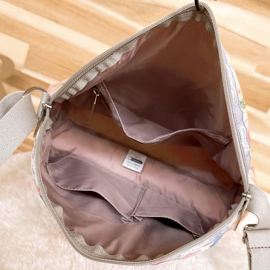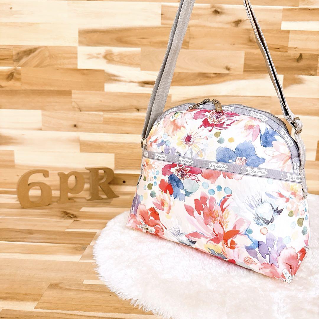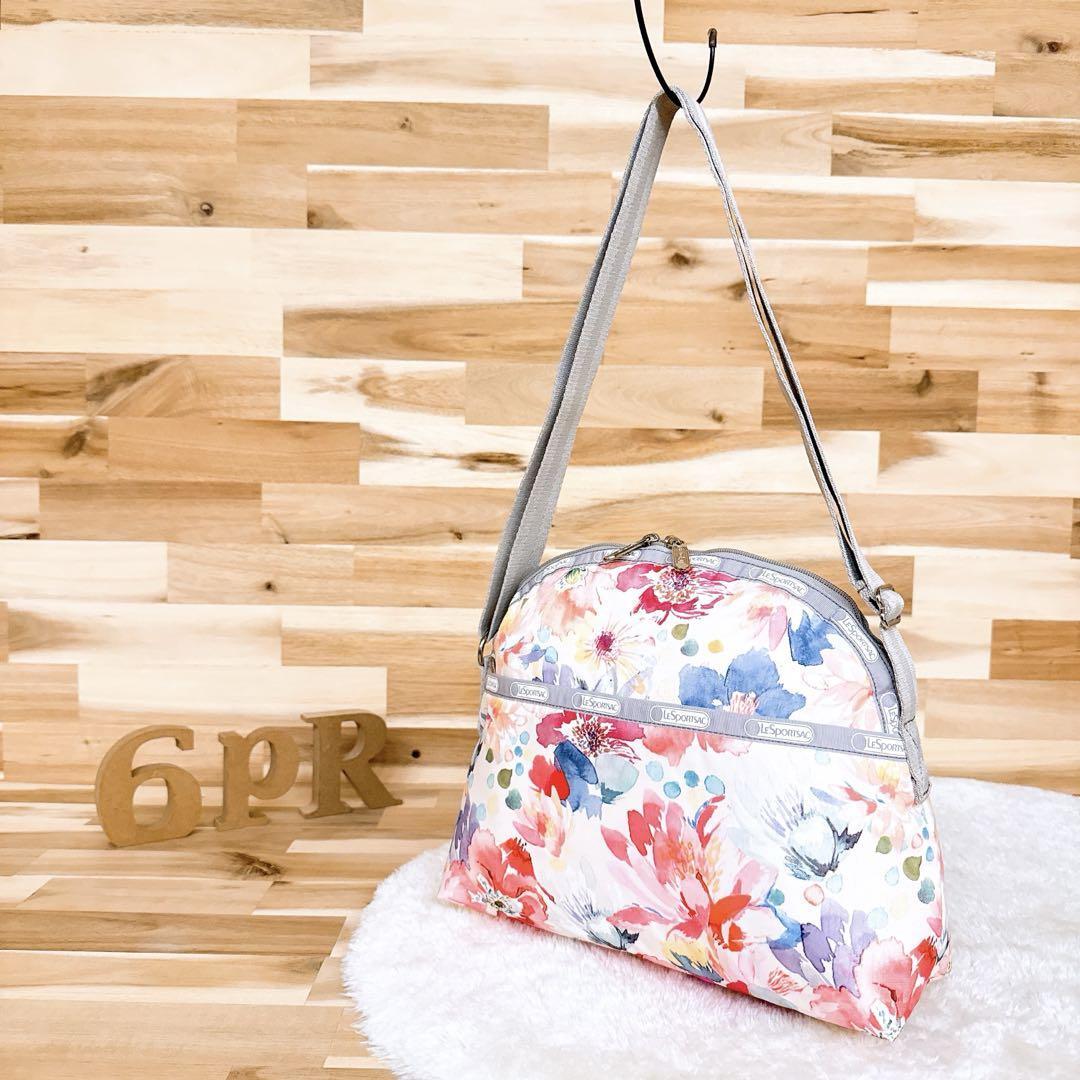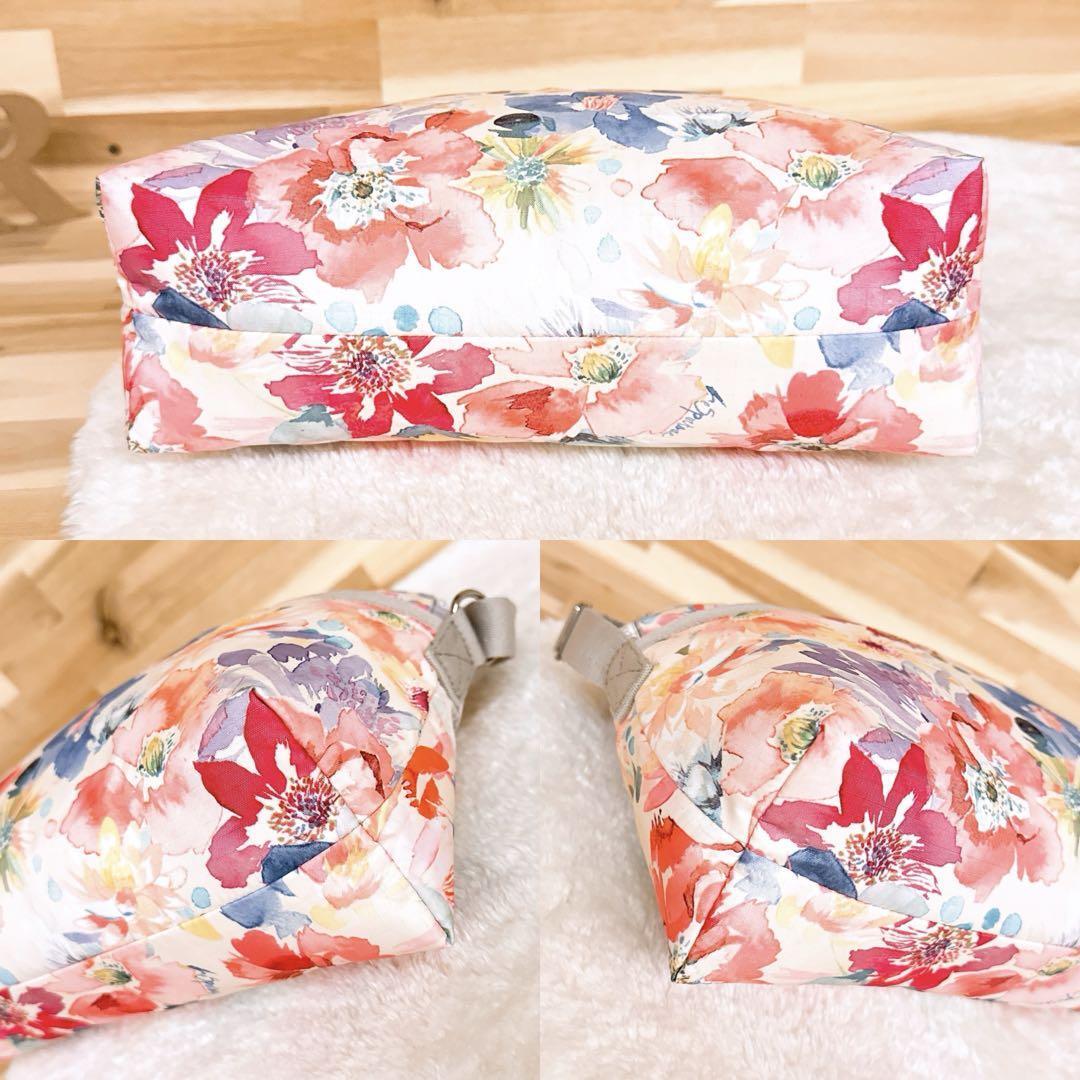 水彩のようなタッチで描かれた柔らかなフローラルモチーフ×ベースのアイボリーに、ピンクやブルーのアクセントカラーが優しく映えて、見るたびに気分を明るくしてくれる大人オシャレなルックス。さらに淡めのグレージュカラーの縁取りが全体をほんのりと引き締め、華やかさと落ち着き感を演出してくれるLeSportsacのショルダーバッグです。