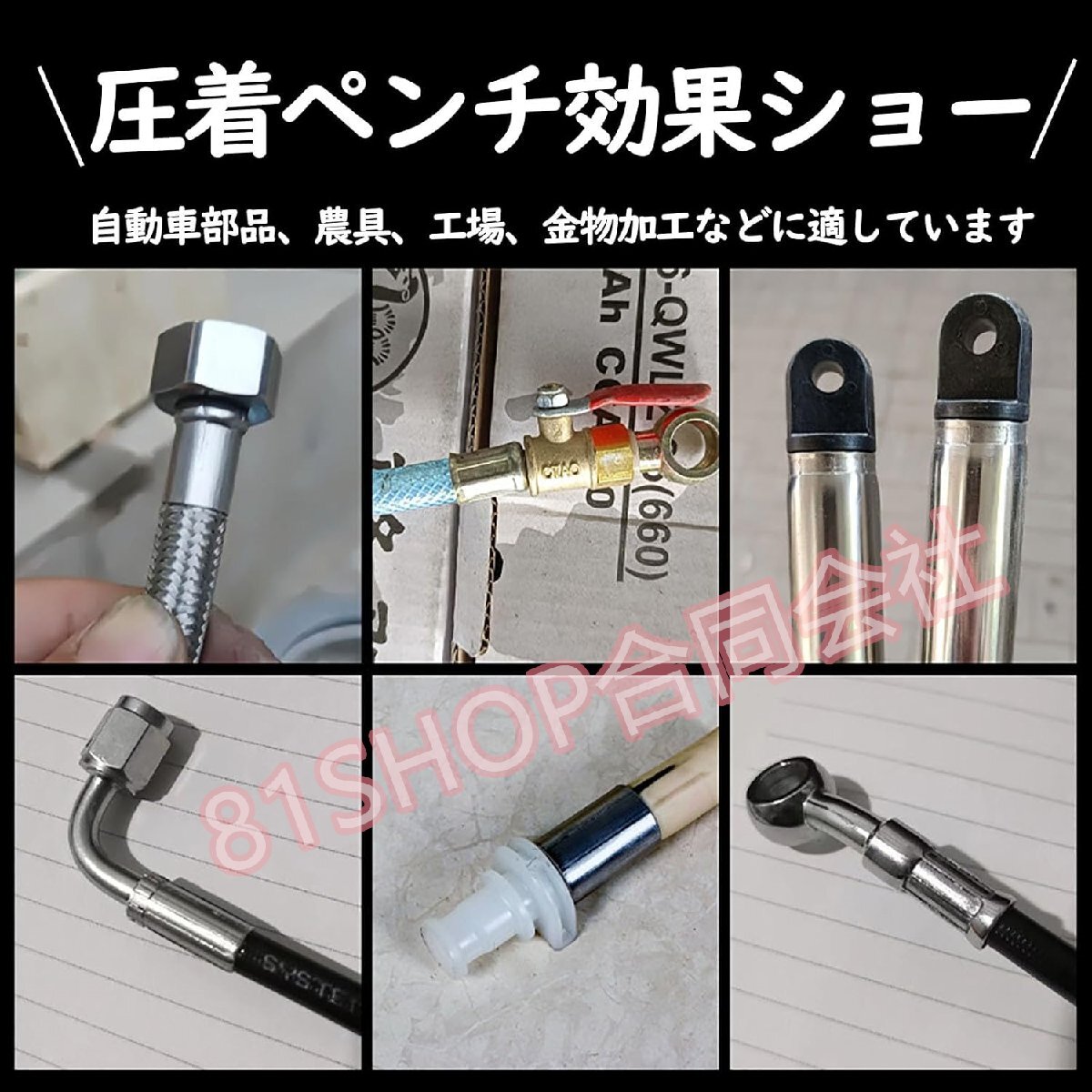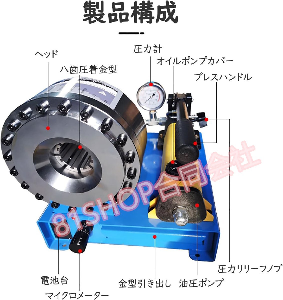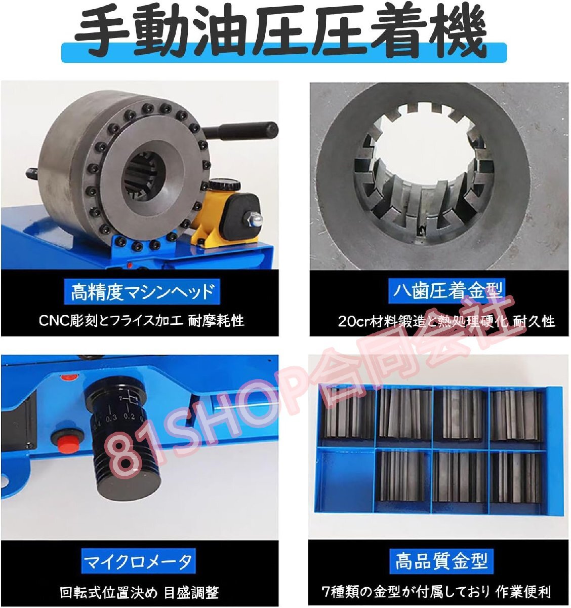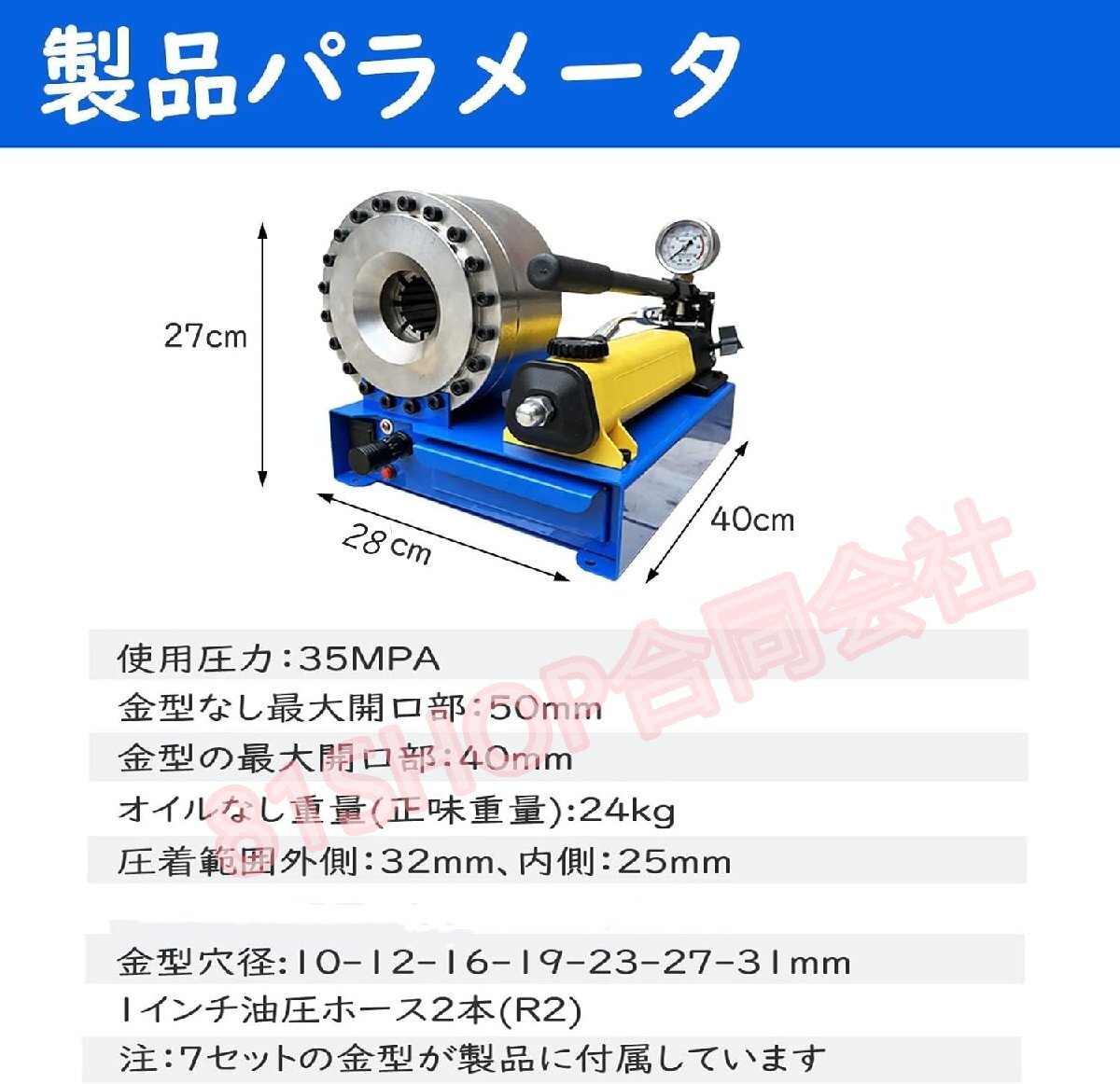 【仕様】7セットの圧着ダイ付き:10-12-16-19-23-27-31mm;圧着範囲:外側32mm 内側25mm;ダイなし最大開口:50mm;ダイの最大開口:40mm;使用圧力:35MPA