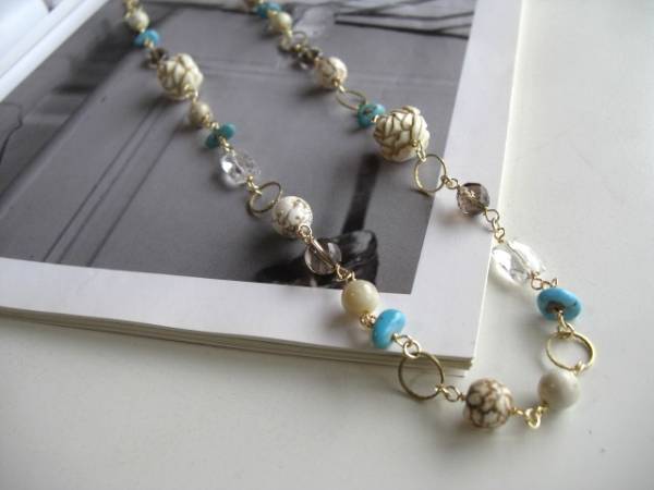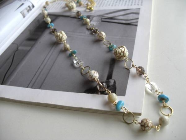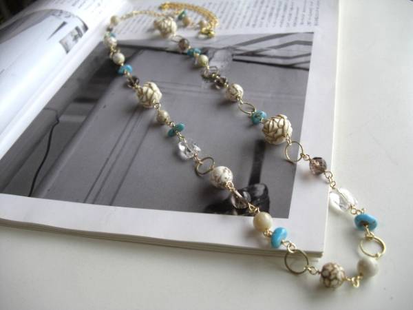 ニューヨーク・テイスト・・シリーズです♪白い薔薇・・個性的な石を集めたネックレスです♪アフリカンオパールやターコイズ、スモーキークォーツやクラックルストーンやドイツ樹脂薔薇を合わせてロマンチックな表情です♪ターコイズのさざれやスモーキークォーツの10ミリのオーバルや6ミリ、8ミリのラウンドカット、水晶のスクエアカット、アフリカンオパールの丸玉、ドイツの樹脂薔薇は16ミリ位です♪淡い色でまとめてやさしい表情です♪長さは全長102センチ位で調節自由です♪2連にされても素敵です♪お揃いのネックレスやブレスレットも出品しています♪♪シンプルで長く着けていただけるデザインを考えて作りました♪ハンドメイドをご理解頂いてノークレーム、ノーリターンでお願いします