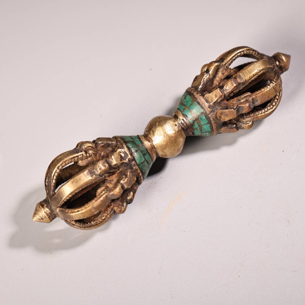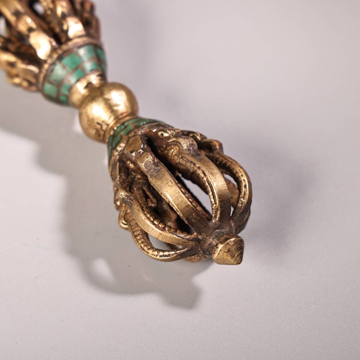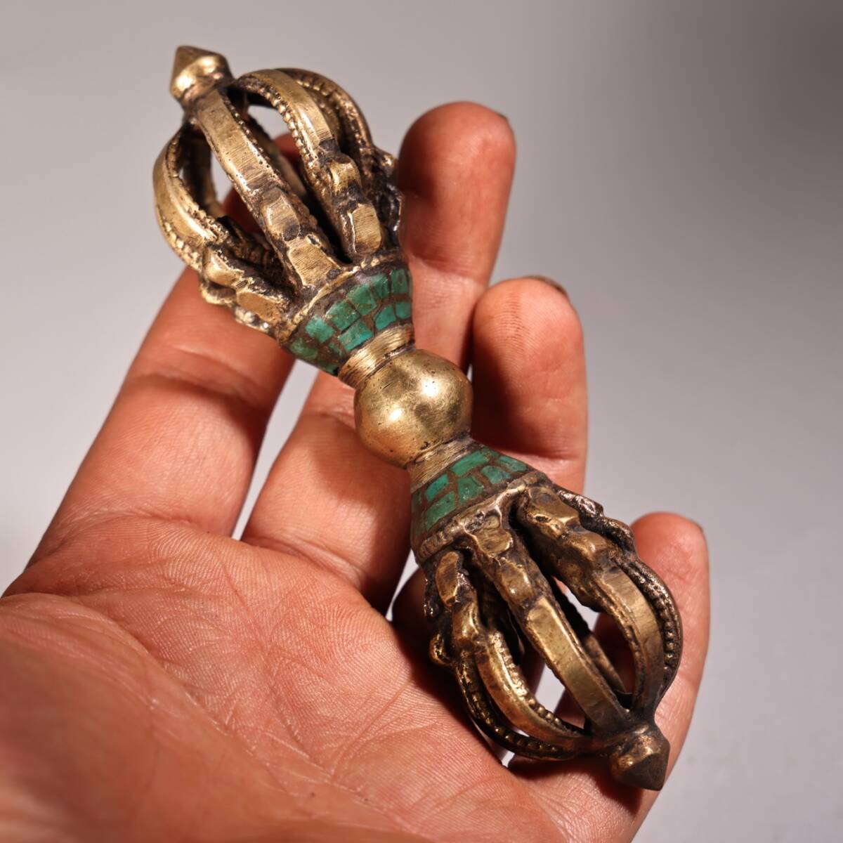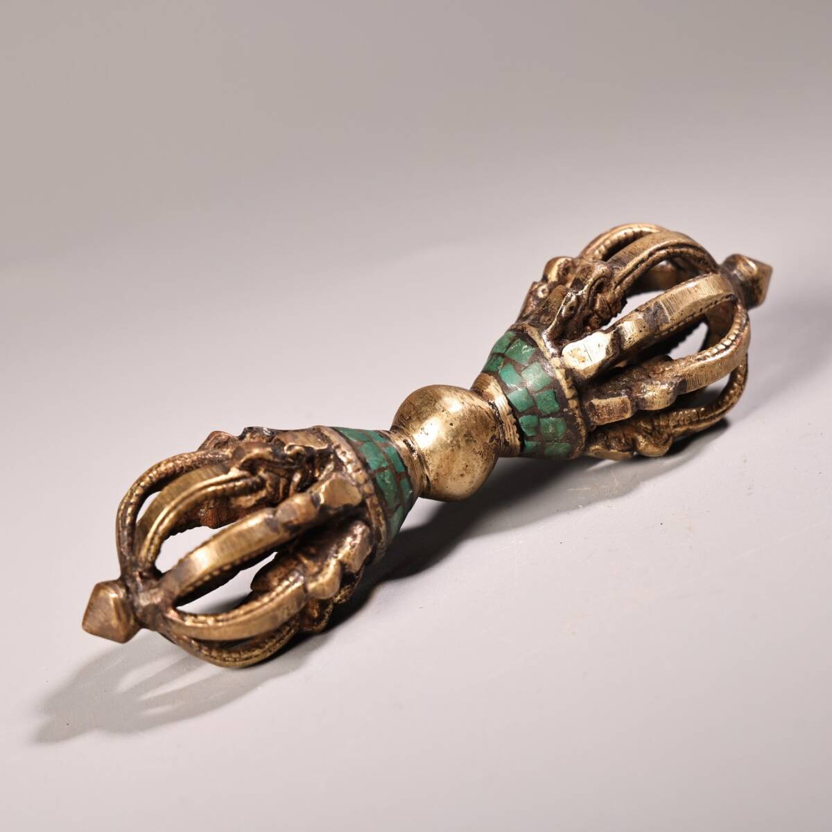 古寺廟結縁 古銅彫 手工嵌宝石 九股多杰金剛杵 法器 法具 風水鎮宅 極細工 古賞物 古美味 東洋彫刻 時代物 骨董 中国古美術