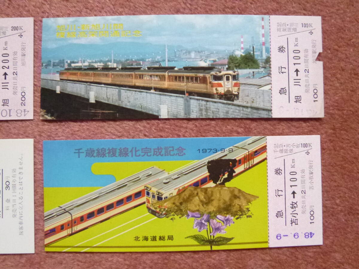 旭川⇔新旭川間複線高架開通急行券2枚(内1枚は入鋏済み)、特急オホーツク運転網走駅入場券1枚、千歳線複線化完成記念急行券のバラ切符4枚のセットです。