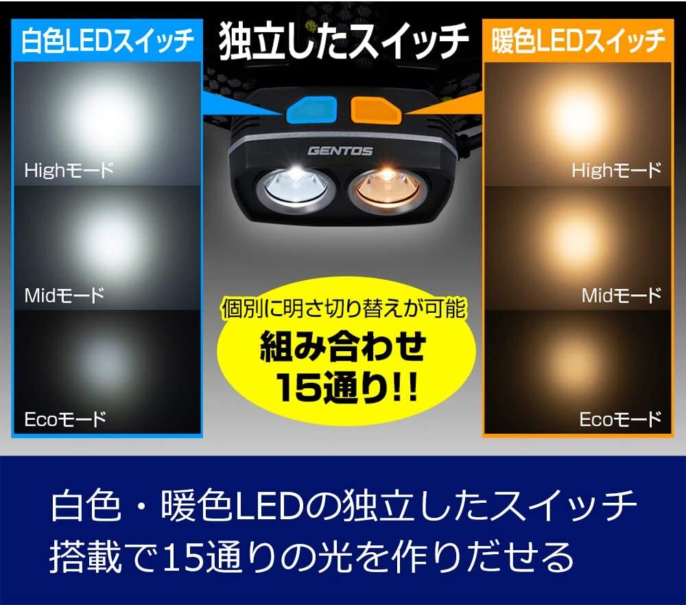 ・明るさ:全点灯 high/400ルーメン、全点灯 mid/ 240ルーメン、全点灯 eco/ 100ルーメン、白色 high/300ルーメン、白色 mid/ 160ルーメン、白色 eco/ 60ルーメン、暖色 high/200ルーメン、暖色 mid/ 110ルーメン、暖色 eco/ 50ルーメン、使用電池:単3形アルカリ乾電池×3本