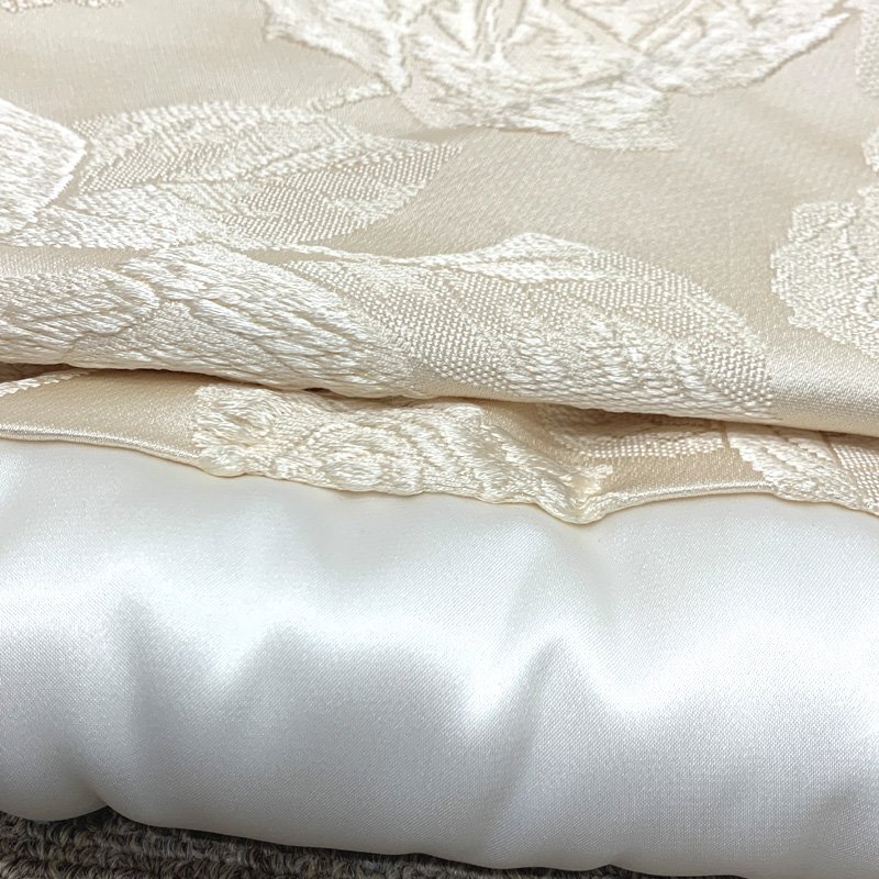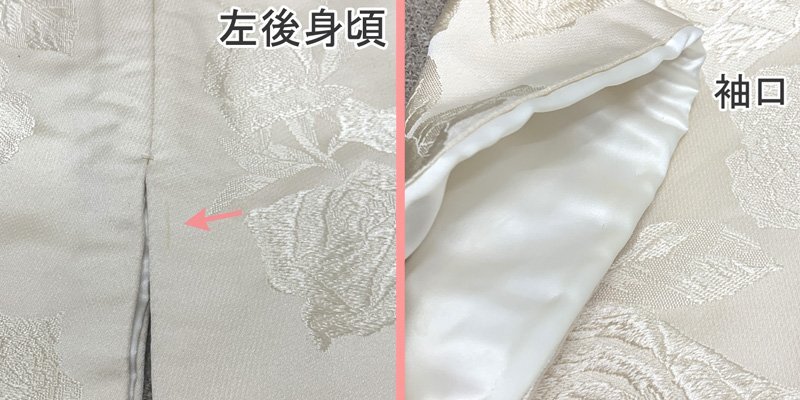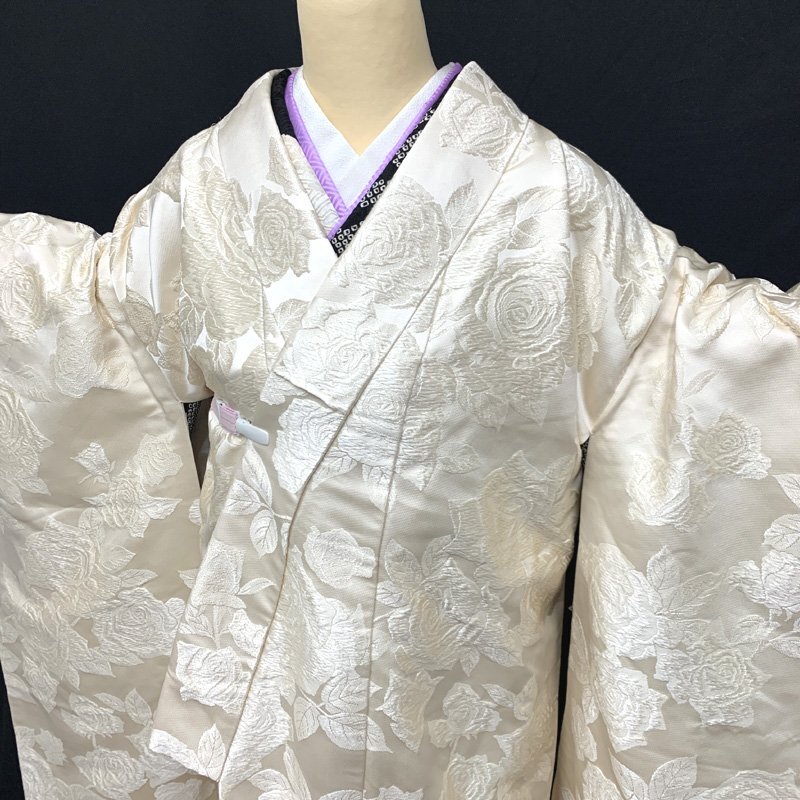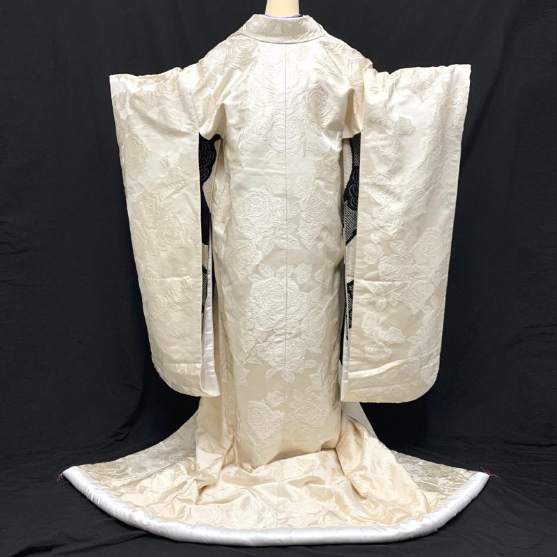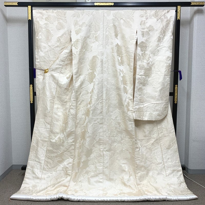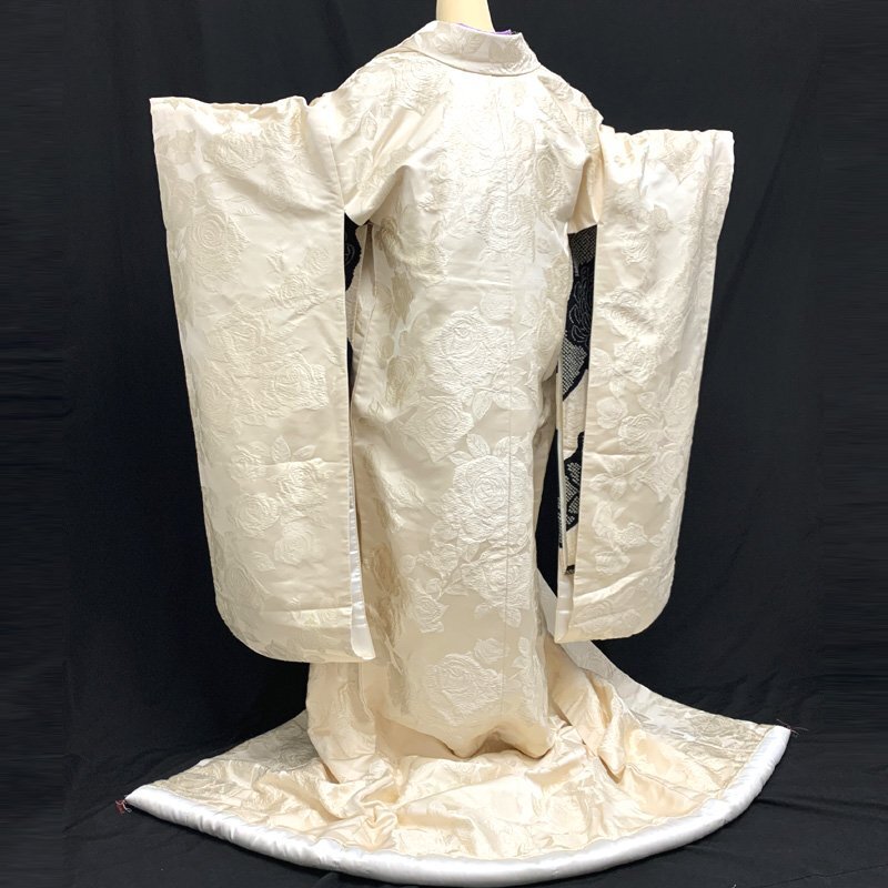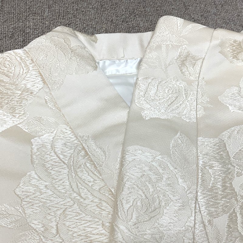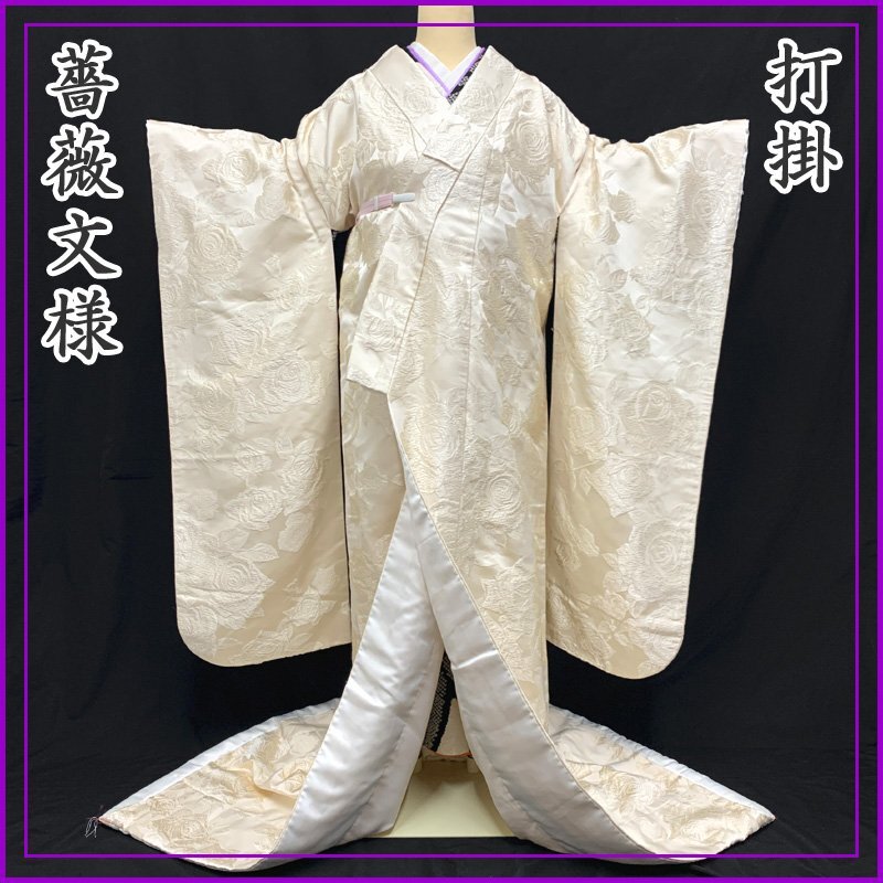 〇打掛 薔薇 結婚式 ブライダル お色直し〇美品 (No.end) アイボリーの地にバラが織り出された打掛です。結婚式のお色直しや和装の前撮りにいかがでしょうか? (こちらの商品は打掛のみです。画像の振袖や小物類は参考商品です。) レンタルアップ品で、左後身頃(袖の縫込み辺り)と袖口(着用の際は見えない部分)にシミがございます。糸の緩みや細かく薄いシミはございますが、大きく目立つようなダメージはなく美品です。 【素材】正絹 【色】アイボリー *モニターによって色味は実際と異なる場合がございます。 【サイズ】