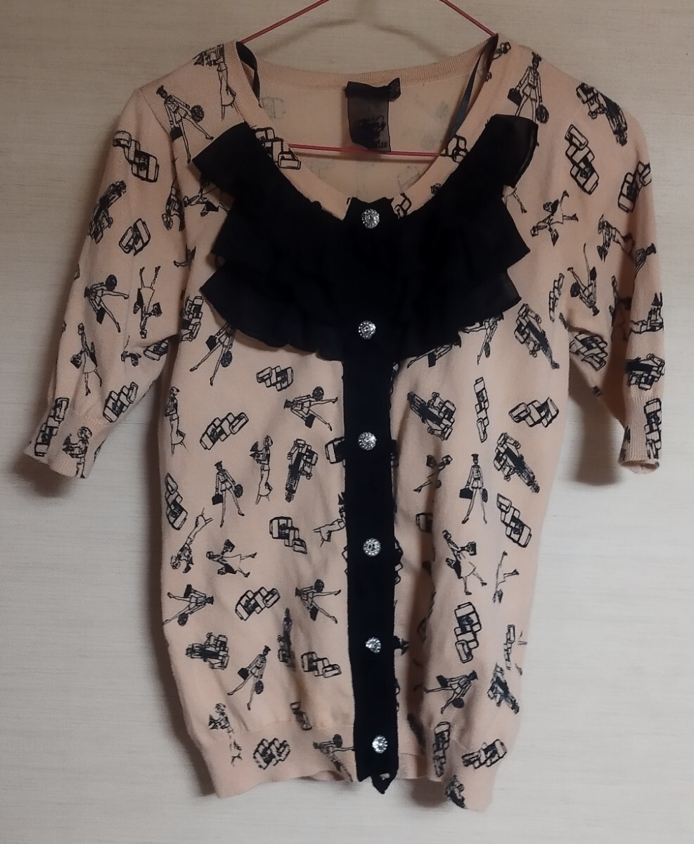 ベージュピンクに黒のフリルやキラキラのボタンがレディライクなカーディガン