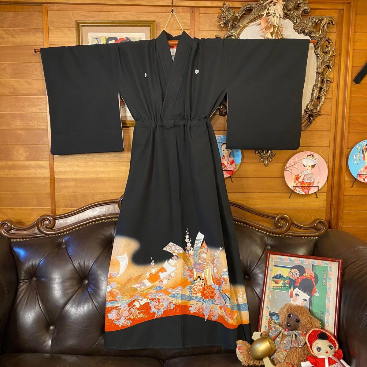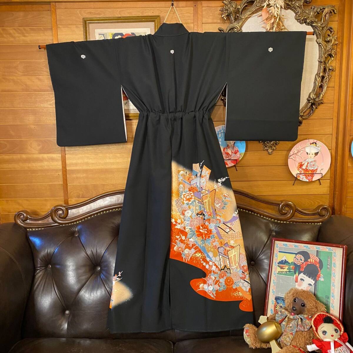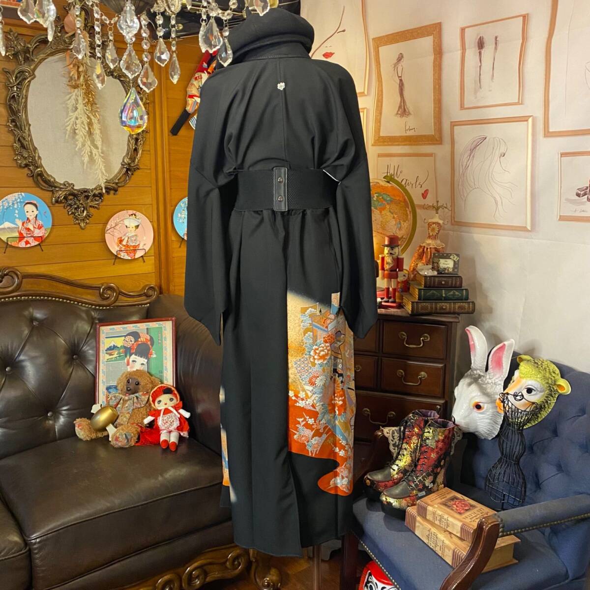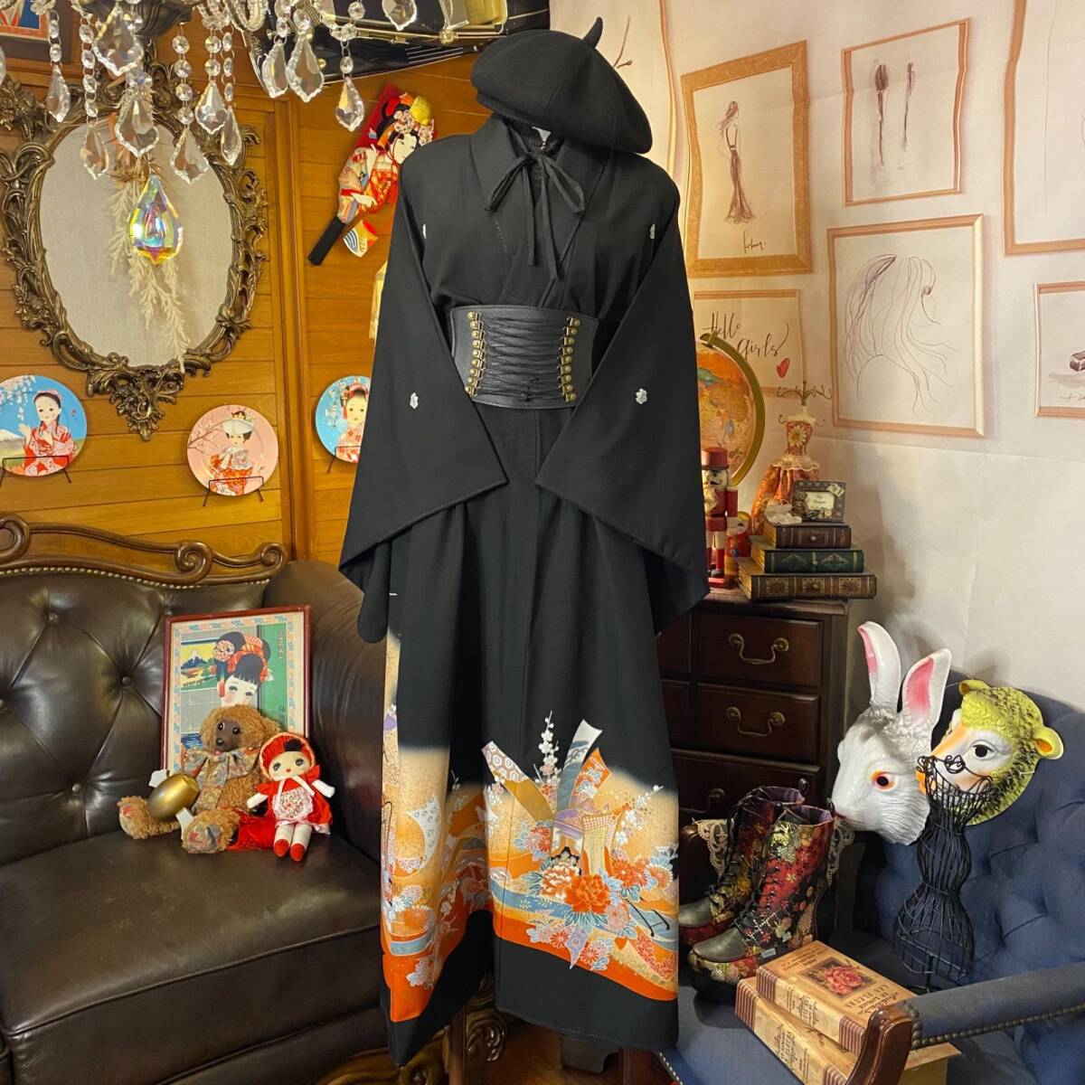 【 和洋折衷 黒留袖 着物 リメイク ワンピース ドレス 洗える 化繊 ハンドメイド レトロ 古着 和 モダン 黒/ブラック TKW-33 】