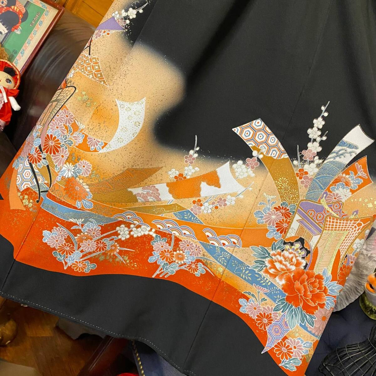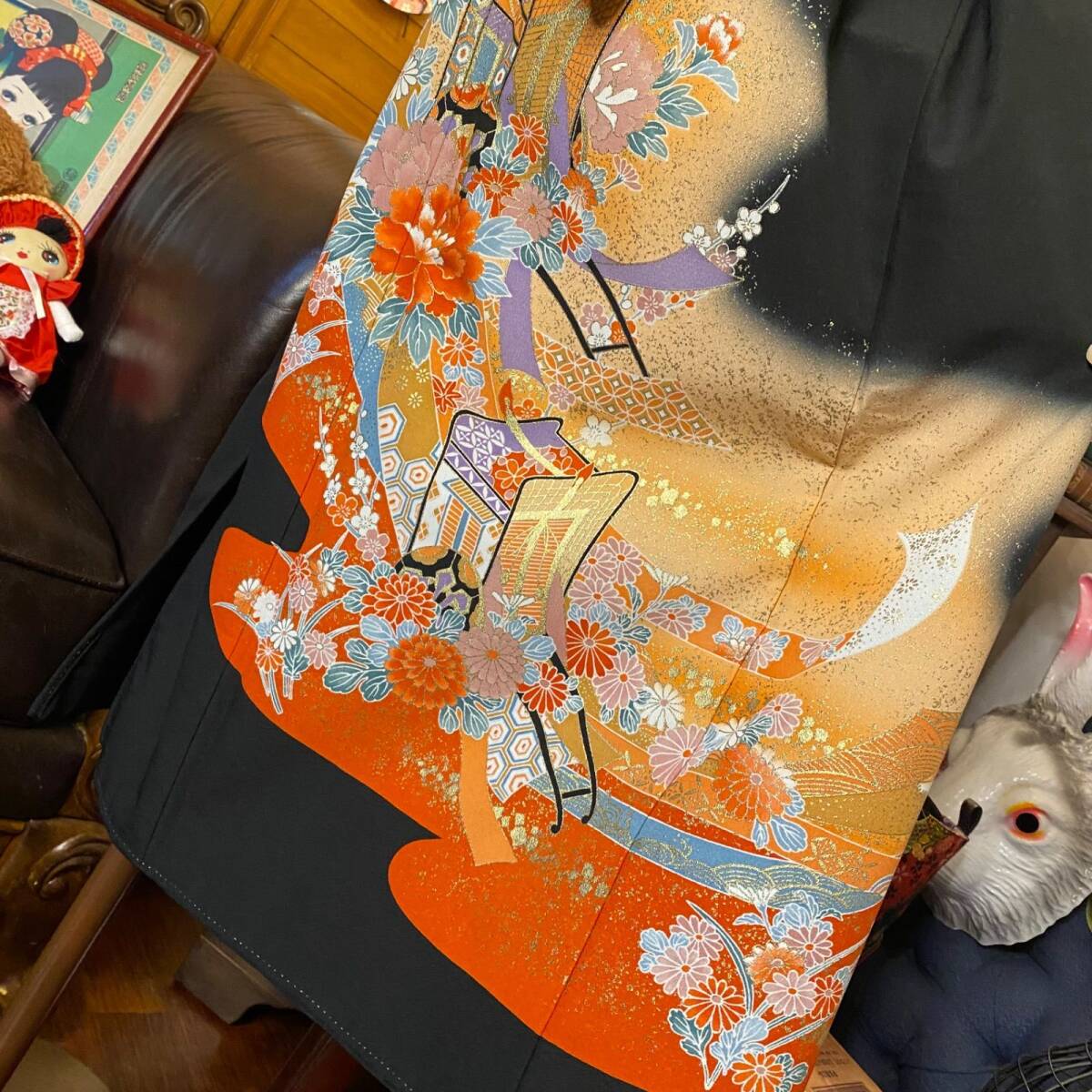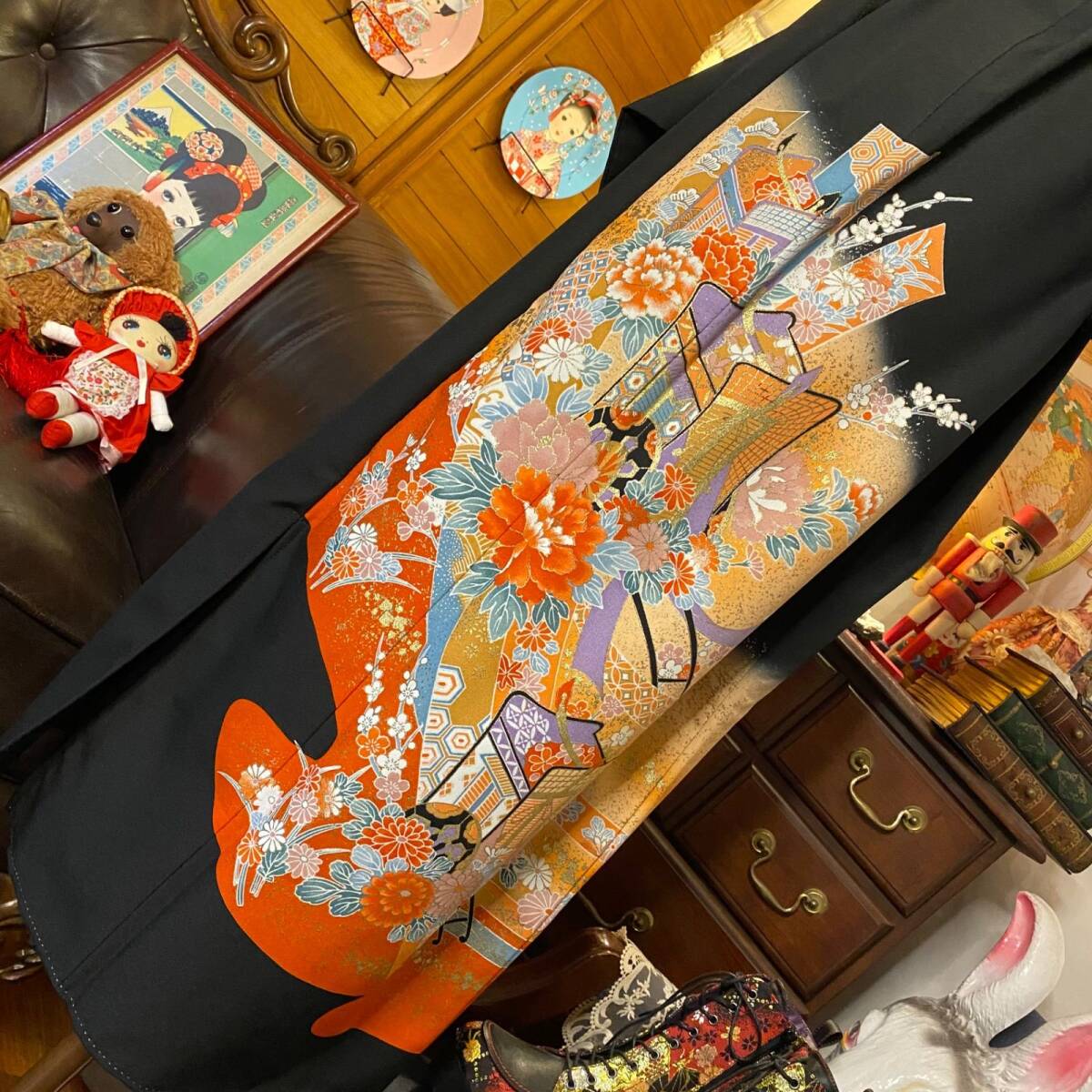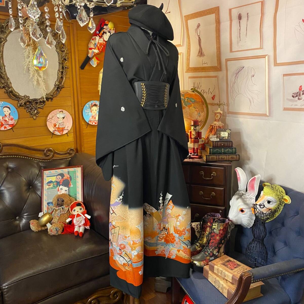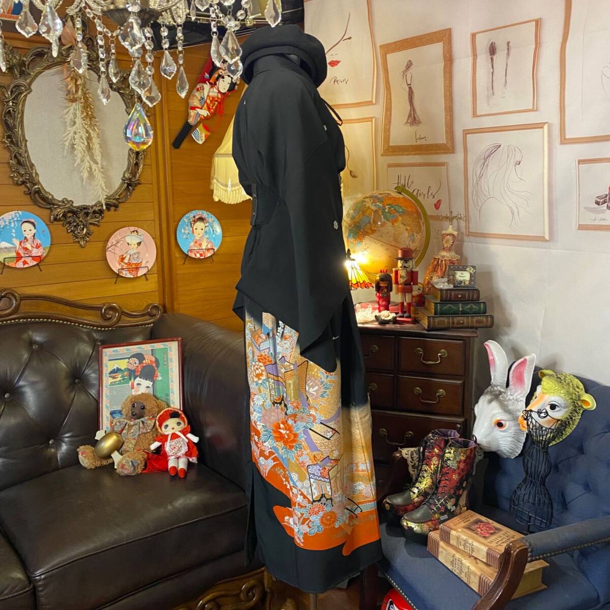 【 和洋折衷 黒留袖 着物 リメイク ワンピース ドレス 洗える 化繊 ハンドメイド レトロ 古着 和 モダン 黒/ブラック TKW-33 】