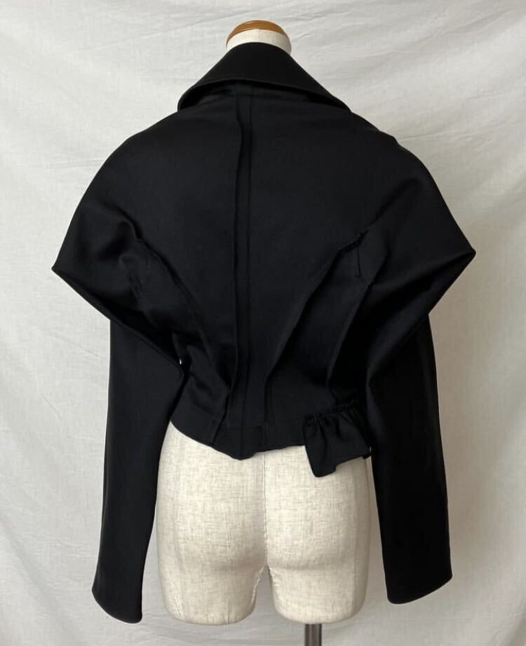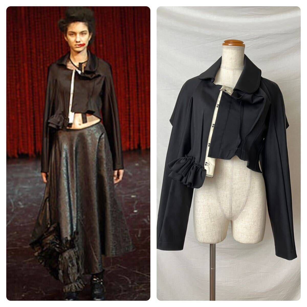 かなり破壊的なデザインで、縦横無尽の切り替えし、アシンメトリーにねじれたような襟、片方にだけあしらわれたフリルなど。凝りに凝った作品です。