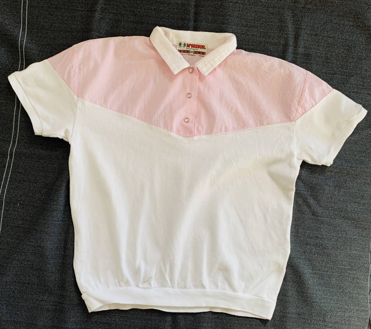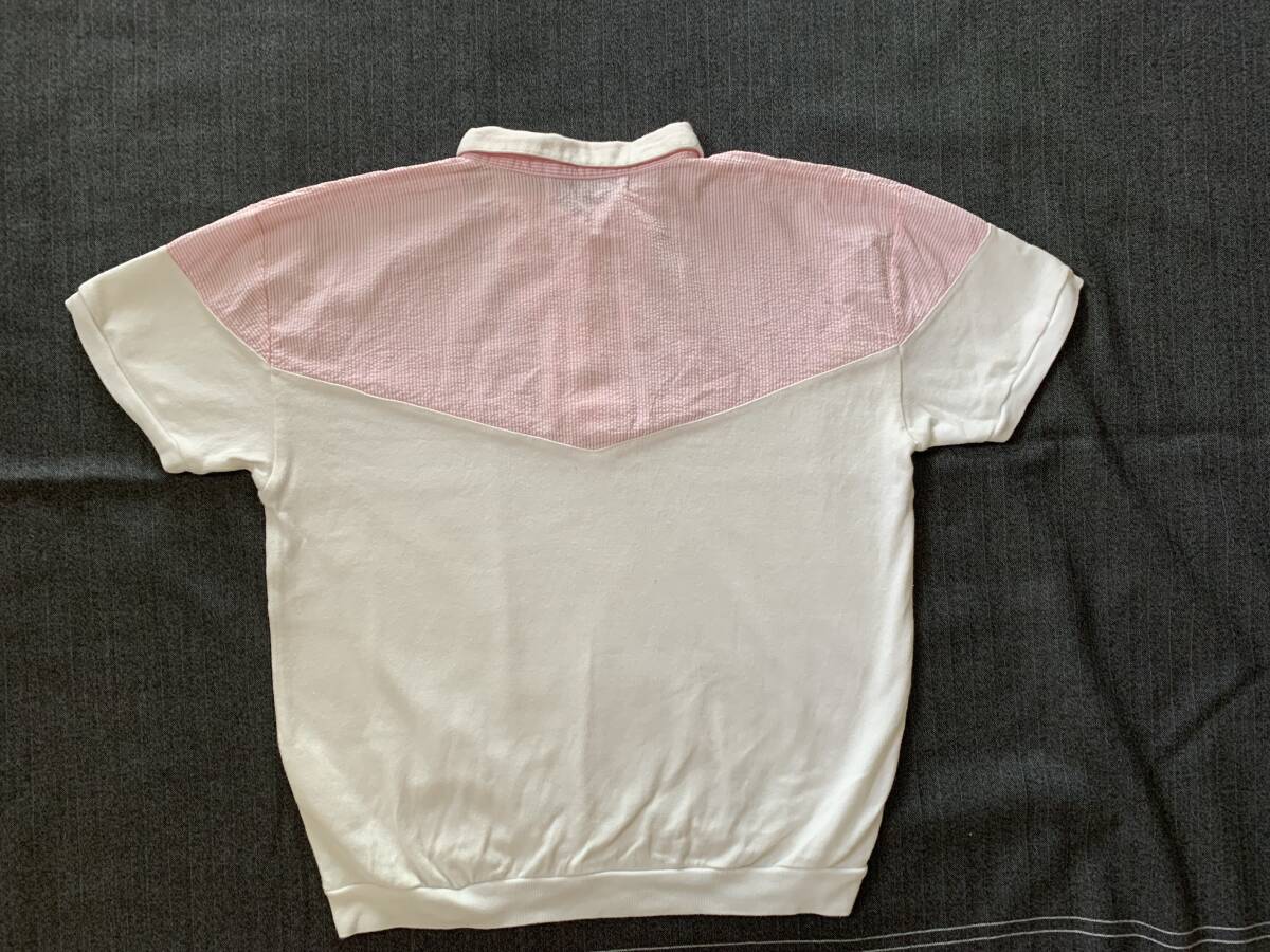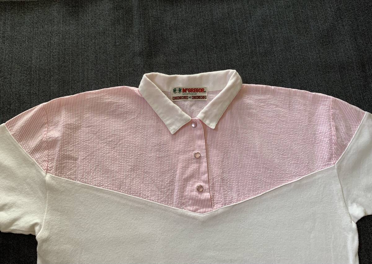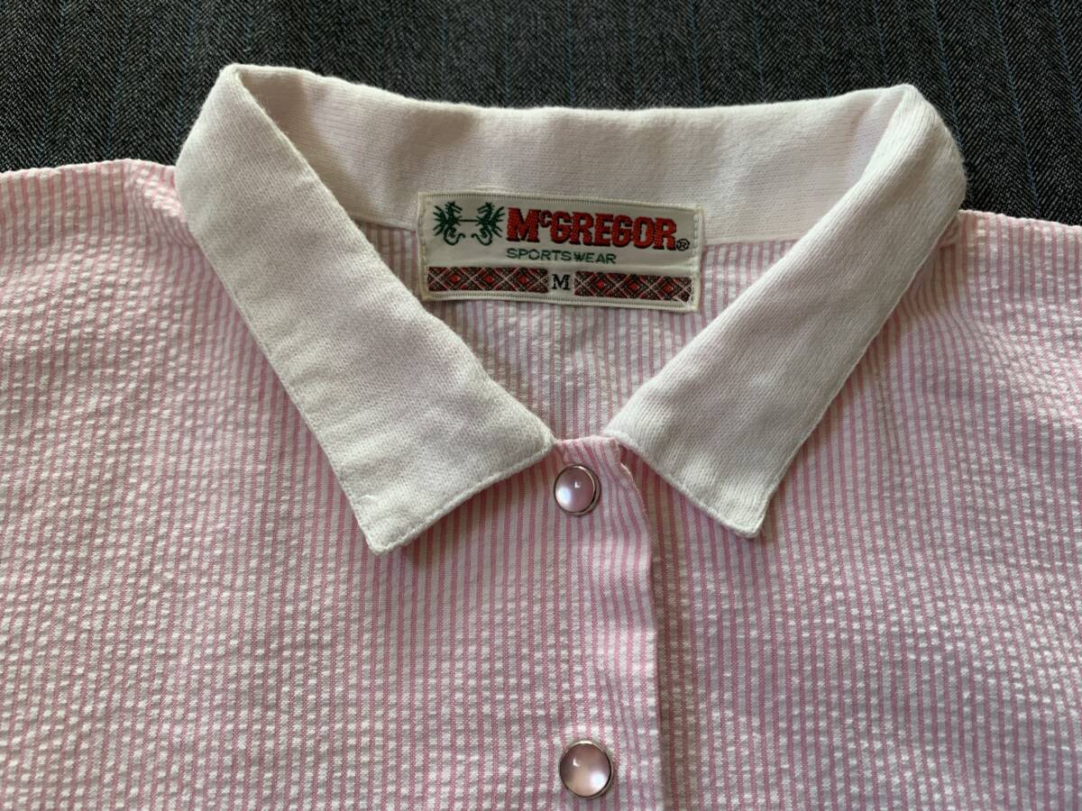 テニスやゴルフに向いているデザインなのでラルフローレンのタグをお借りしています。マックレガーの白地に胸から肩、背面にピンクとホワイトのストライプのシアサッカー地の切り替えが入ったポロシャツです。ボタンも立体的で透明なピンクで可愛く(画像3枚目)、Mサイズです。慨寸身幅46センチ、着丈55センチ。綿100%。白ですがほとんど着用せず保管していたので、シミなどのダメージはありません。コットン100%。日本製。usedにご理解のある方のみご購入くださいませ。