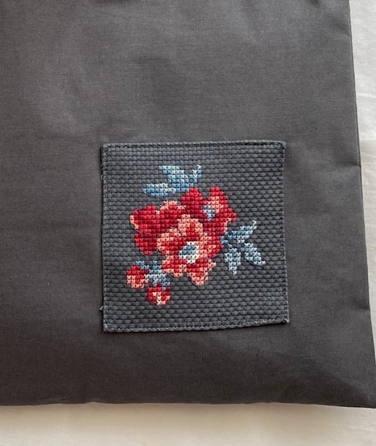 飾りの刺繍部分はあまり目立たないように、グレーのクロスステッチ生地を使いました。