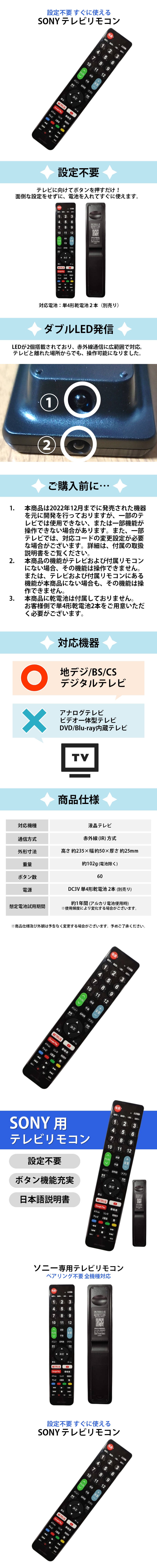 | SONYの液晶テレビに対応したテレビリモコンです。互換品です。純正品ではございません。純正リモコンが壊れた 見つからない 効きが悪い スペア(予備)が欲しい 買い替えたい方にオススメです。■特徴設定不要ですぐに使えて快適2つのLED信号により広範囲で操作可能太字で表示された押しやすい大きなボタン純正品とほとんど同じ配置で違和感無し軽量で手にフィットして持ちやすい分かりやすい日本語説明書付き■商品仕様対応メーカー:ソニー,対応機器:2022年12月以前に生産された国内向け赤外線対応液晶テレビ,通信方式:赤外線(IR)方式,外形寸法:高さ約235×幅約50×厚さ約25mm,重量:約102g(電池除く),電池:単4形乾電池 2本(別売り),内容物:テレビリモコン×1,※本商品に乾電池は付属しておりません。※製造工程の更新により、商品仕様及び外観は予告なく変更する場合がございます。※本商品はあくまで互換リモコンですので、機種によっては一部特殊機能が使用できない 一部ボタンが反応しない 純正品より反応が鈍い可能性がございます。上記を理由とする返品や交換は受付かねます。予めご了承下さい。 |