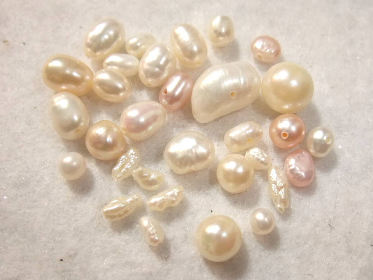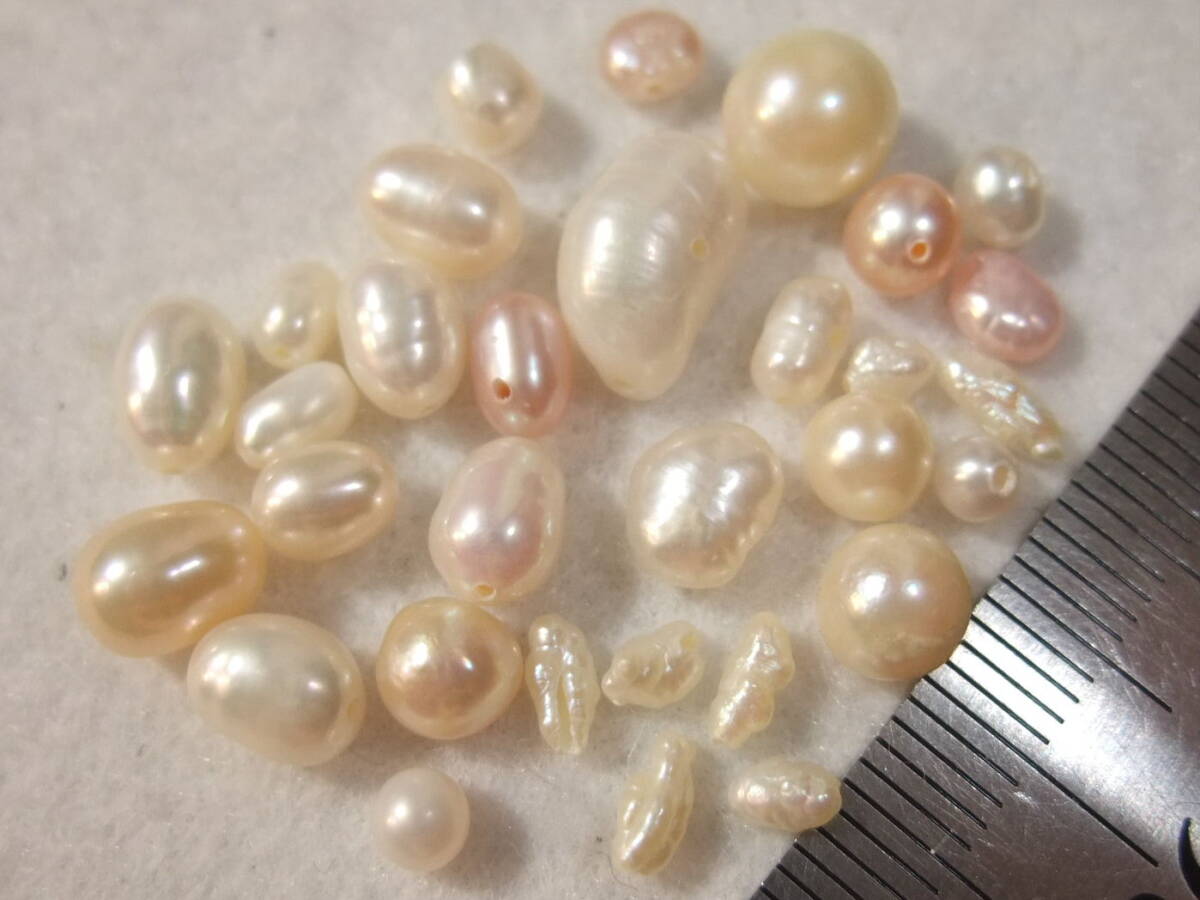 サイズも状態もシェイプも穴あけも色々混じりの、古い在庫など未使用の、アコヤ真珠と淡水真珠の中粒~小粒メインのアソートセットになります!