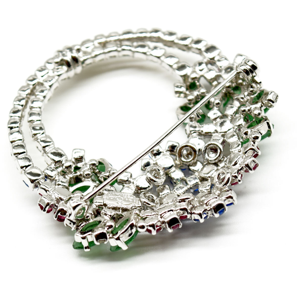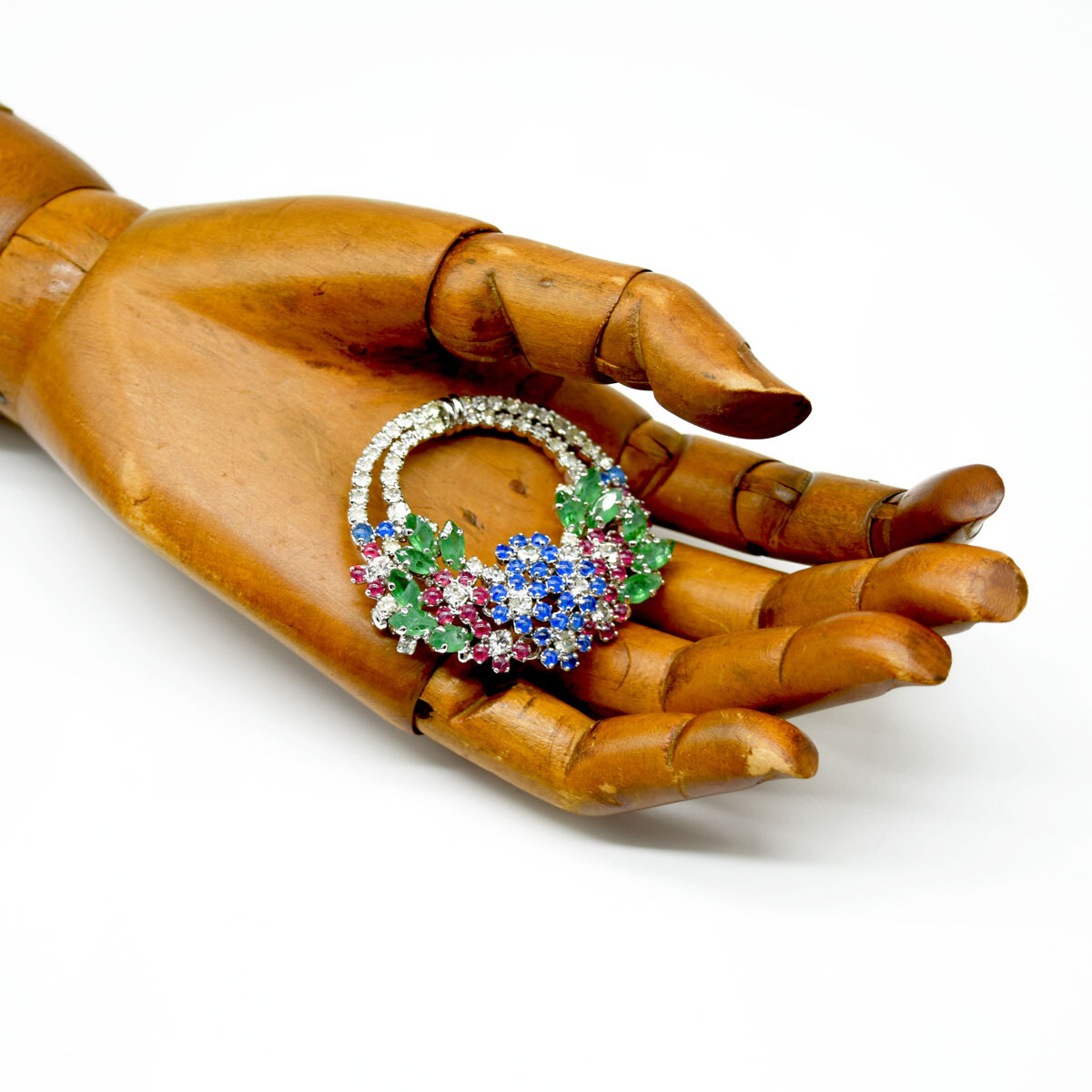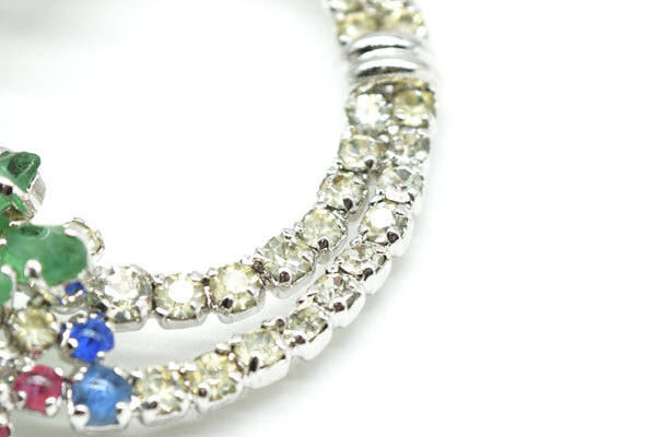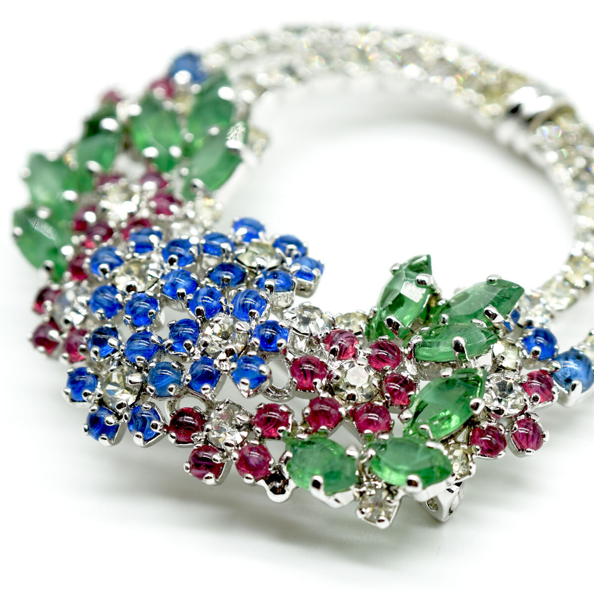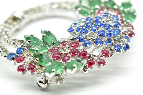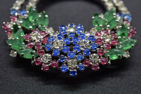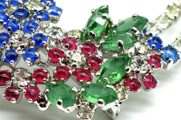 ルビーやサファイア、エメラルドを模したガラスの花や葉を