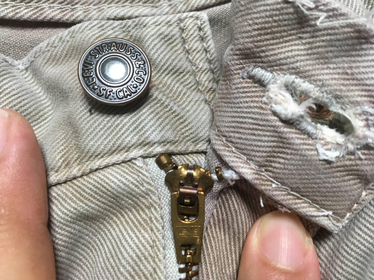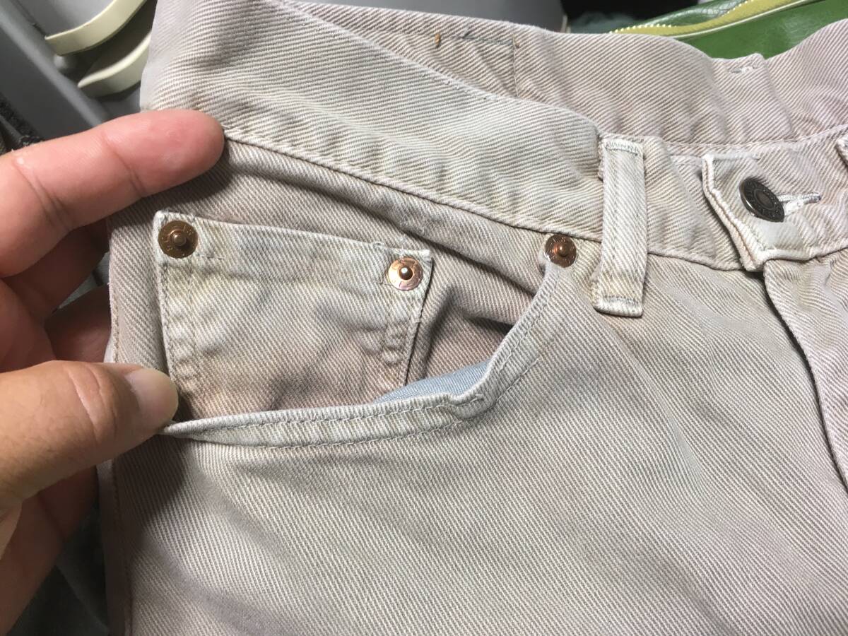 ホワイトタブ、内股ダブルステッチ、バックポケット縁チェーンステッチで、
