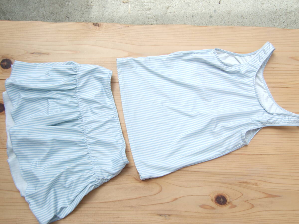●上下2点。記名なし。パットなし。パットポケットあり。つるっとした生地です。使用感、新品と中の間くらい毛立なく綺麗なお品ですがパンツのクロッチ部分が水色の糸で縫われてます(画像4参照)。スカートにショートパンツがくっ付いています(画像3参照)。