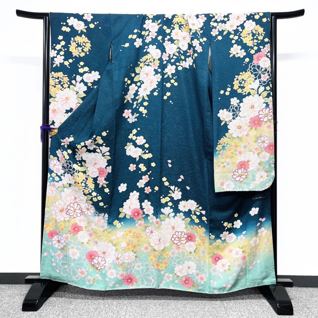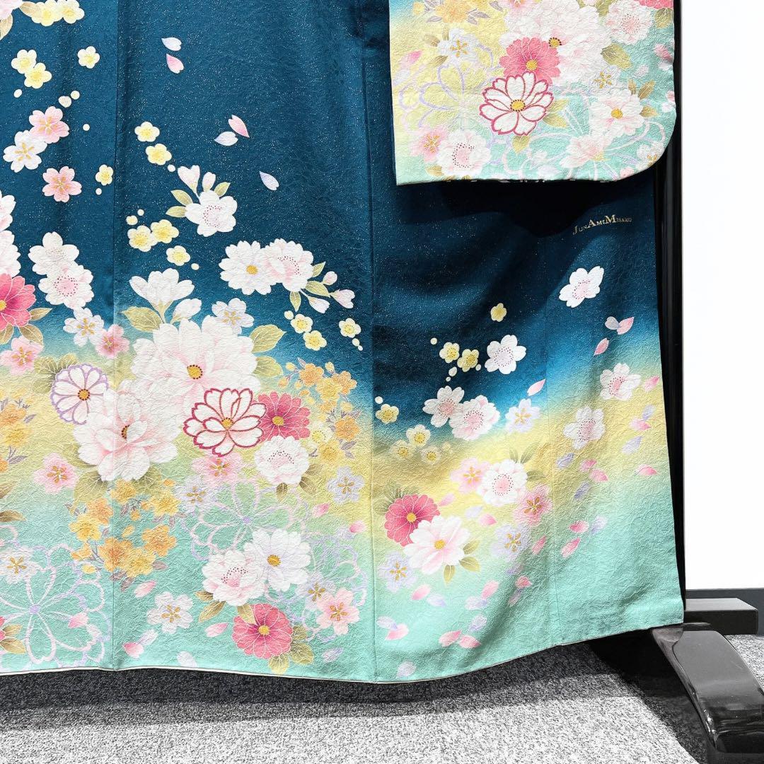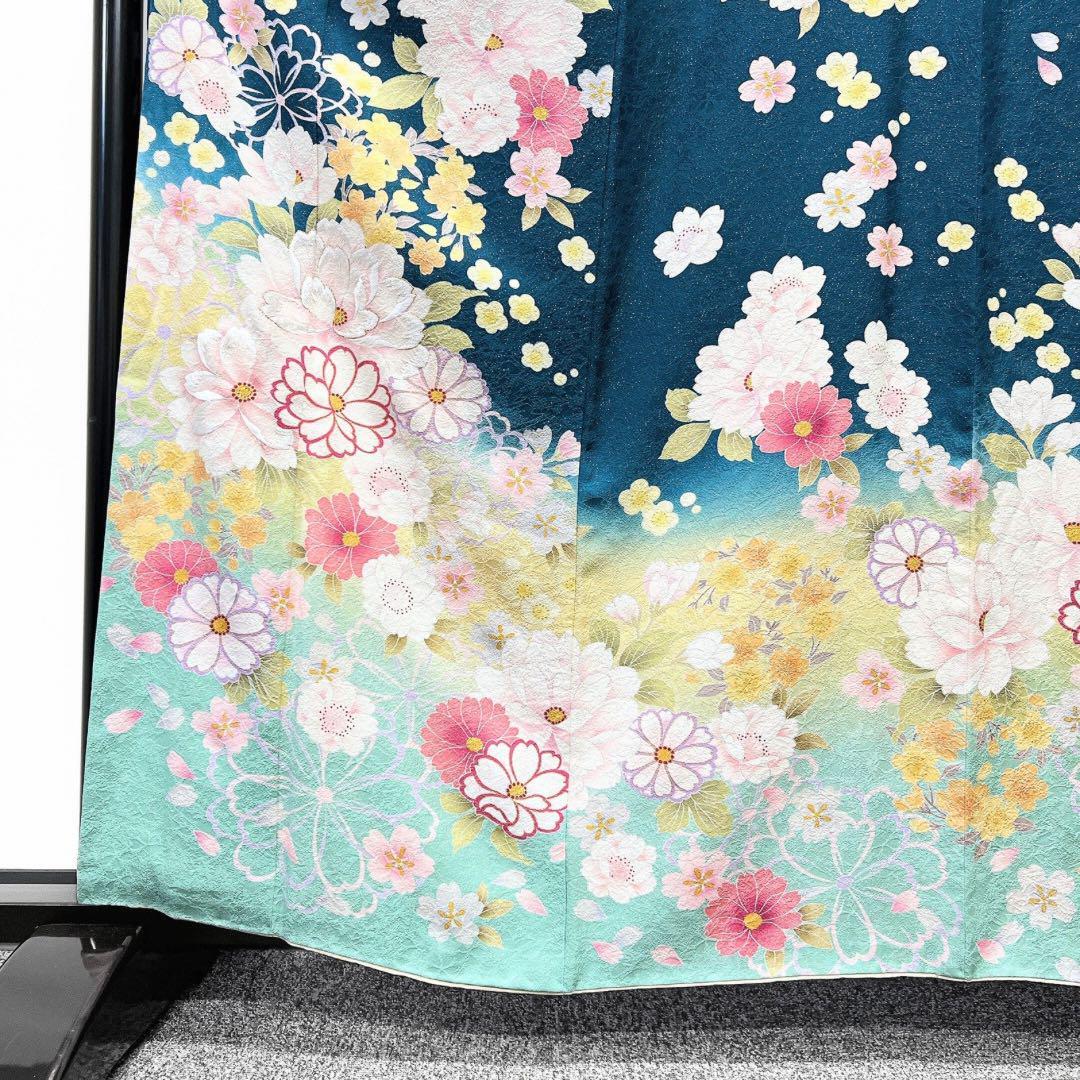 JUNAMIMISAKOの銀通しの生地に華やかに咲く花模様、グラデーションが美しい振り袖です。