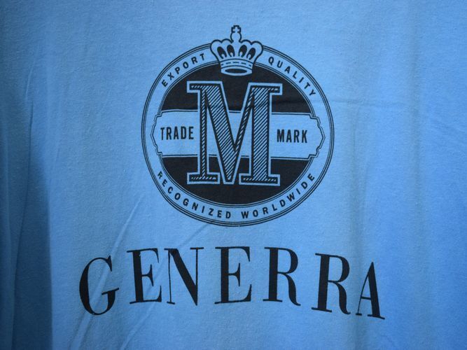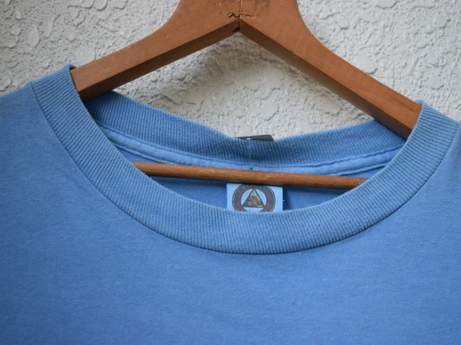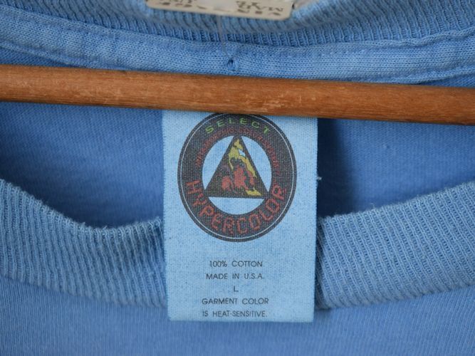グッドプリント!!USA製90sビンテージHYPERCOLOR企業物クルーネックオールコットンプリントTシャツL水色アメカジストリートnr238