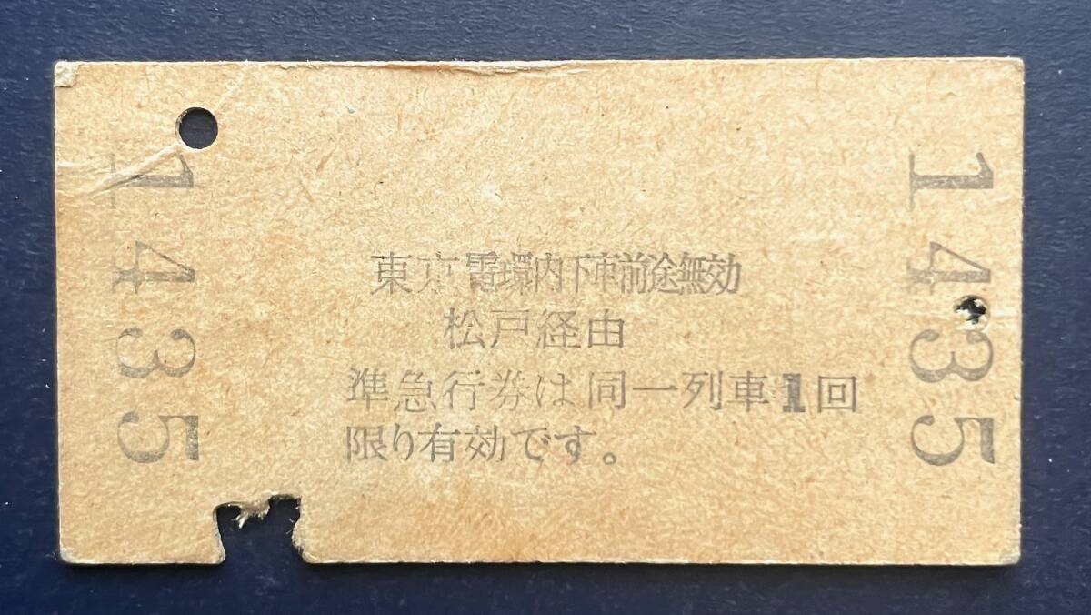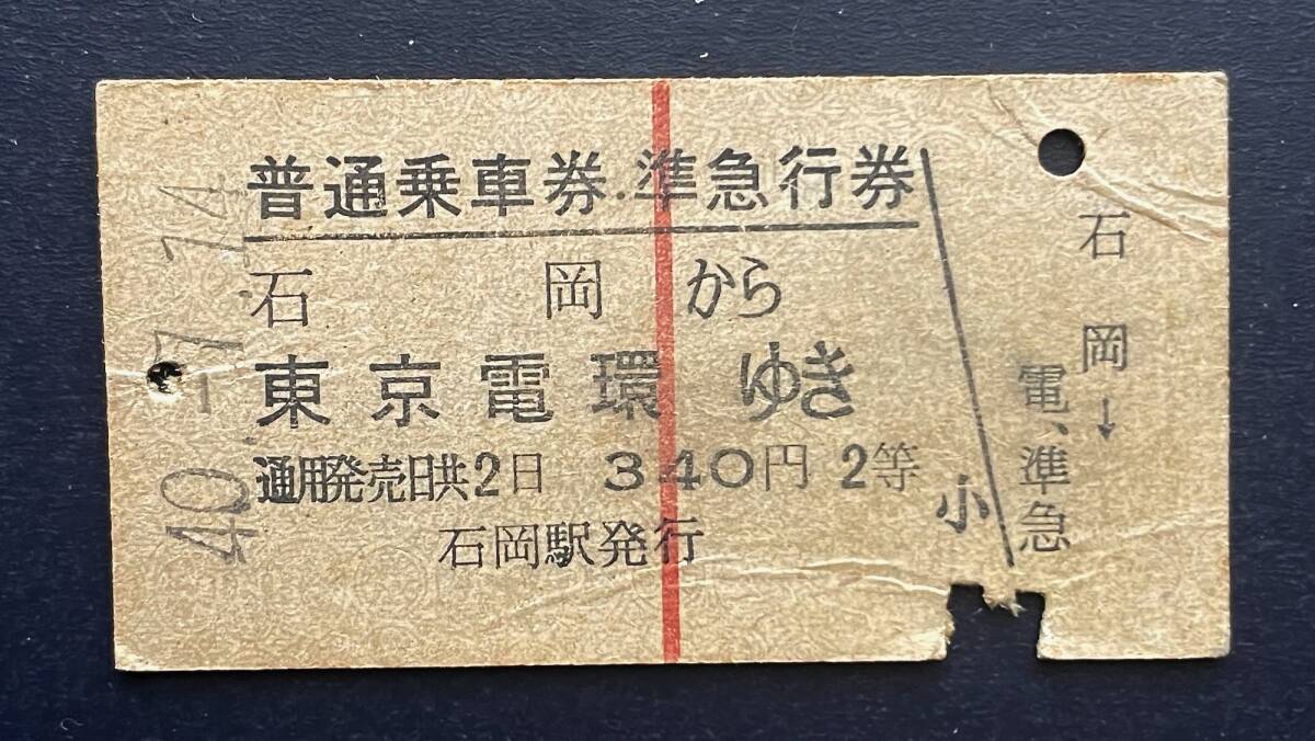 国鉄、硬券、常磐線 石岡駅−東京電環、乗車券+準急行券、昭和40