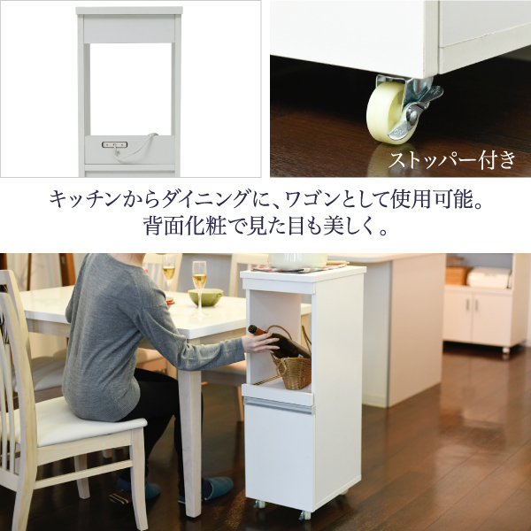 商品説明 | 家電の収納に便利なコンセント付きスライド棚と、収納物に合わせて高さ調節ができる可動棚付きの食器棚をこれ1台で。 【仕様】 ■本体サイズ [外寸]幅30×奥行39.5×高さ90cm ■その他サイズ [内寸] (スライド部)幅23×奥行30×高さ35.5cm (スライド引き幅)33cm (扉内)幅24×奥行28.5×高さ35cm (可動棚)幅25.5×奥行33×厚み1.8cm(3.2cmピッチ3穴) ■材質 [天板・前板・スライド棚]合成樹脂化粧合板(PVC) [本体]プリント紙化粧合板 ■収納量・耐荷重 [天板]約5kg以下 [スライド棚]約5kg以下 [可動棚]約5kg以下 ■備考 ・背面化粧有り ・可動棚:1枚 ・合計1500Wの2口コンセント付き(コード長さ196cm) ・キャスター4個(うち2個ストッパー付き) ■生産国 中国 ■組立時間(目安)(大人2人) お客様組立(40分) ■キーワード スリムラック すき間 キッチンすきま収納 隙間家具 すき間家具 隙間キッチン キッチンボード 洗面所 スライド 棚 木製 キャスター付 コンセント付 電気ポット コーヒーメーカー 炊飯器 食器 家具 おしゃれ 収納 新生活 ひとり暮らし ロータイプ 30センチ 幅30cm 奥行40cm 90cm |