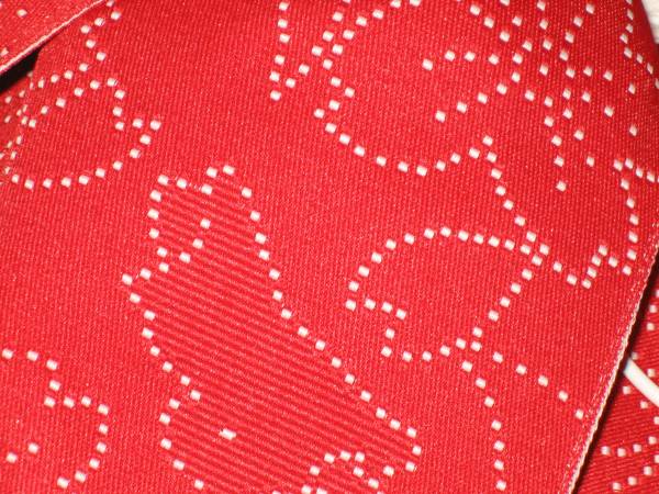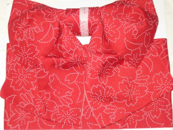 女性yukata用、地紋柄結び帯  あか ポリエステル  新品(織り地紋柄ありです。波状の写りはレンズの光学的ないたずらで現品にはありません、また薄く濃く写っている場合もあります)、胴部--帯巾約17,0cmx長さ約130cm、リボン部は横に約30cm。見た範囲で汚れないと思いますが、着用に差し支えない薄汚れ(多分ない?)はあってものお値段で出品です。