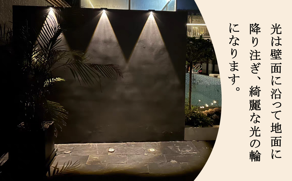 「最高3mの地面に照射可能」明るいledと凸面レンズを使用して、最高3mの地面に照射可能。 明るい光はウッドデッキあるいは壁面に沿って滝のように降り注ぎ、美しい光の輪を作り出します。複数のライトを一緒に使えば、光が重なり、とてもおしゃれな雰囲気になります。