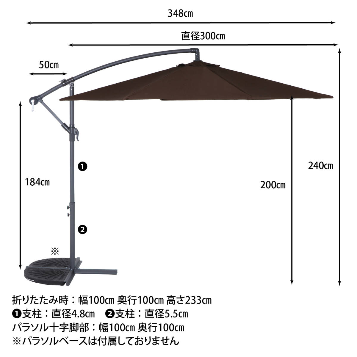 商品説明 | ハンギングパラソル2 ブラウン(36998) 落札後、最初の連絡で配達伝票に記載する電話番号をお尋ねします 支柱が邪魔になりにくいハンギングタイプ。 支柱が邪魔になりにくいハンギングタイプです。 ハンドルを回すだけで簡単にパラソルの開閉ができます。 据付の際は別売の専用ベースを必ずご使用ください。 サイズ・容量 本体サイズ:W300×D348×H240cm 重量:11000g 規格 ■支柱:アルミ ■傘生地:ポリエステル200g/m2 ■フレーム:鉄 |