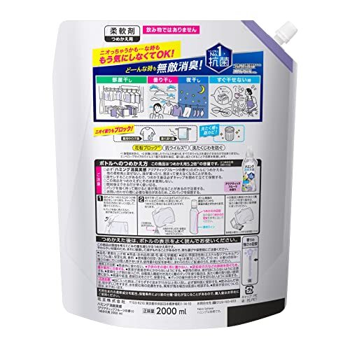 「【大容量】ハミング消臭実感 柔軟剤 部屋干し/曇り干し/夜干しどーんな時も無敵消臭! アクアティックフルーツの香り つめかえ用2000ml」▼4901301418906▼(商品説明)【高さ×幅×奥行き】315×255×139[ミリメートル]・2.0[Litter]・成分:界面活性剤(エステル型ジアルキルアンモニウム塩)、安定化剤、香料・ブラント名:ハミング・メーカー名: 花王説明 商品紹介 ニオっちゃうかも…な時ももう気にしなくてOK! 部屋干し・曇り干し・夜干し・すぐ干せない時も どーんな時も無敵消臭! ハミング史上No.1抗菌* *抗菌できる菌が複数あること。一部の菌は数回の洗たく。 すべての菌の増殖を抑えるわけではありません。 アクアティックフルーツの香り ●ニオイ戻りもブロック!(着用中の汗臭、濡れ戻り臭) ●洗たく槽も防カビ! ●花粉ブロック※1 ※1静電気を防ぐ 原材料・成分 成分:界面活性剤(エステル型ジアルキルアンモニウム塩)、安定化剤、香料