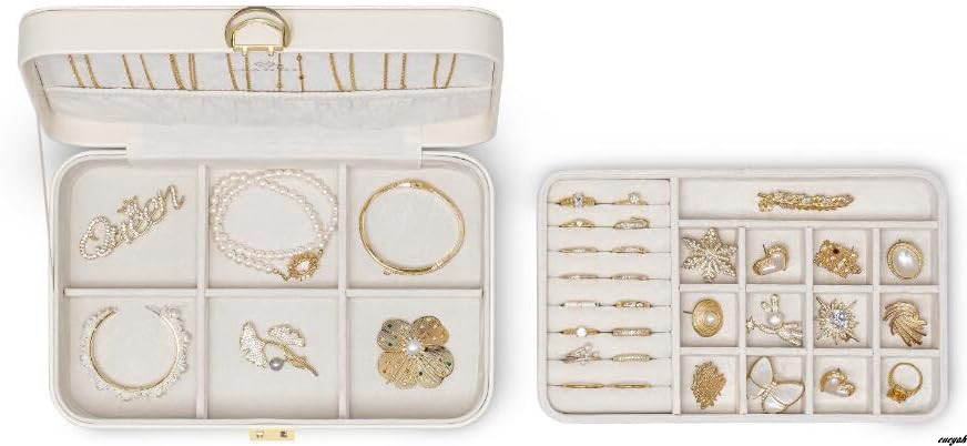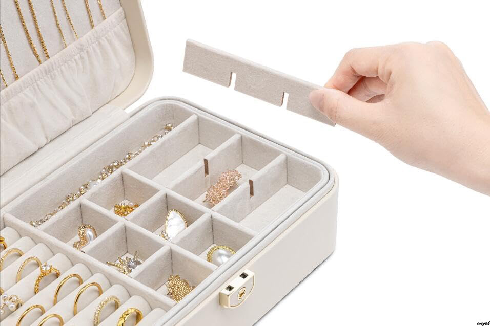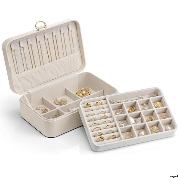 2層式デザインにより、指輪やイヤリング、ブレスレット、腕時計、ブローチなどを分けて収納することが可能。