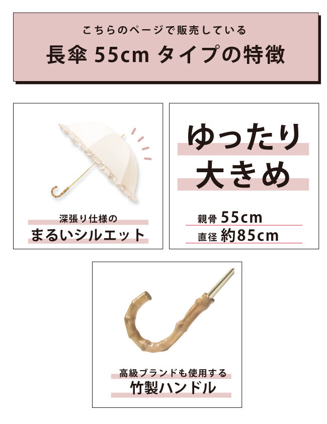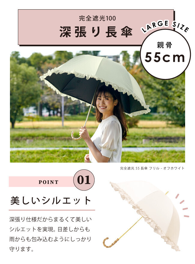 深張り仕様でまるくて美しいシルエットの長傘。日差しからも雨からも包み込むようにしっかり守ります。