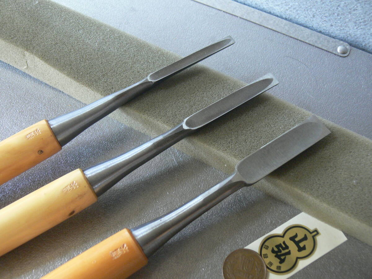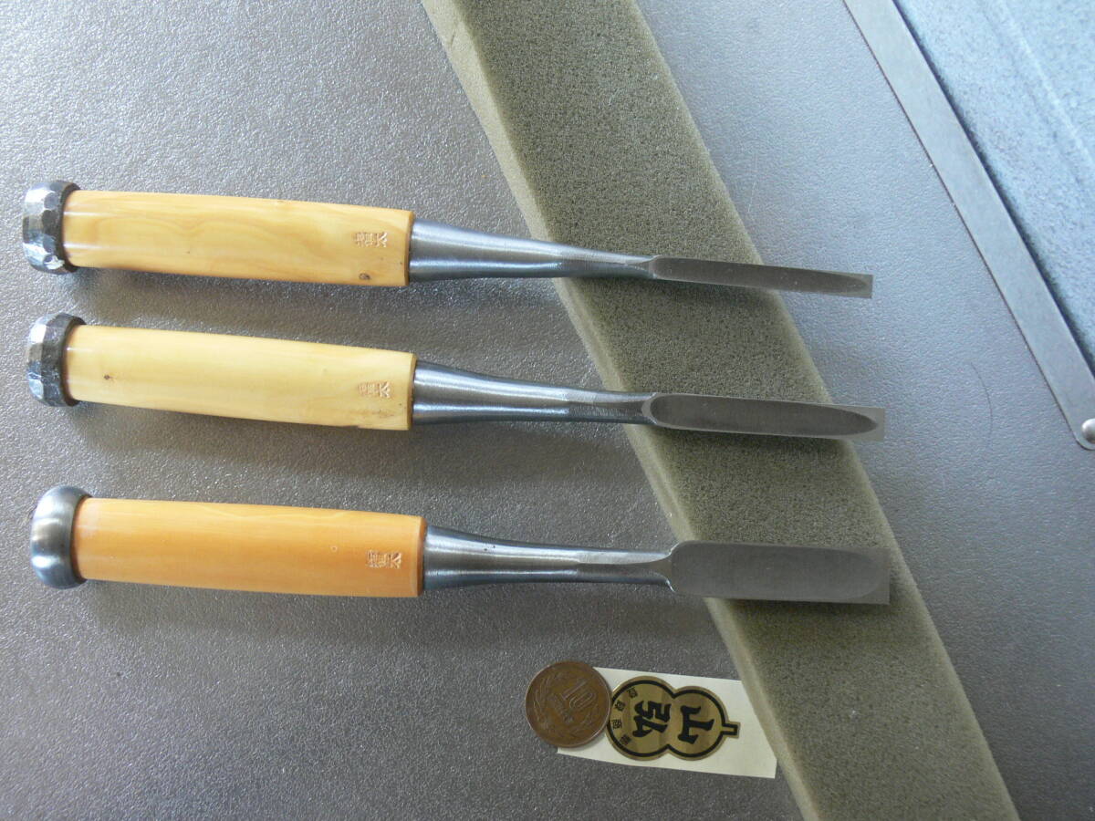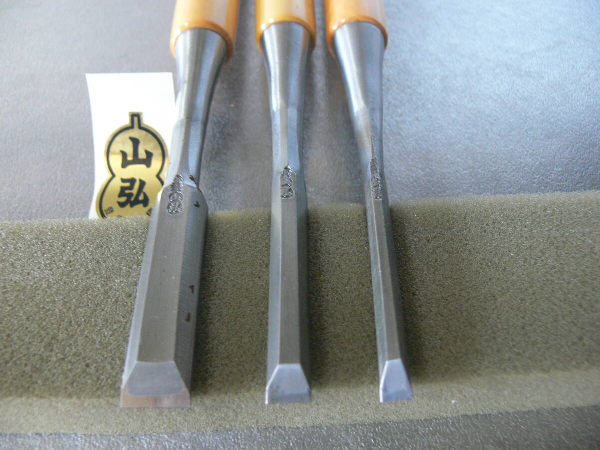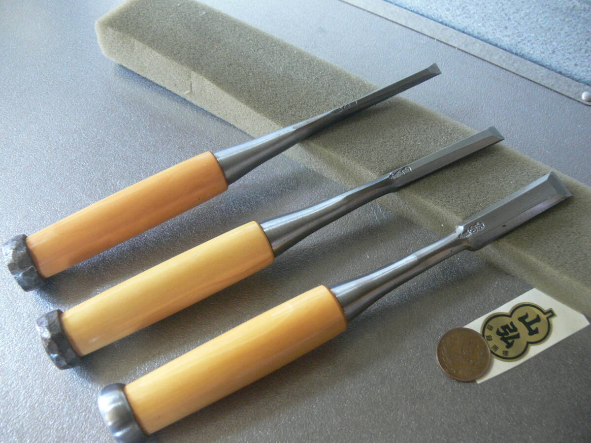 越後三条 岡山猛 山弘 作 磨仕上 面取追入 鑿 白紙一号 松炭焼入 3本(清忠 長弘 市弘 千代鶴 清久 舟弘 海弘 常弘 國慶 越彦 田斎 啓寿)2