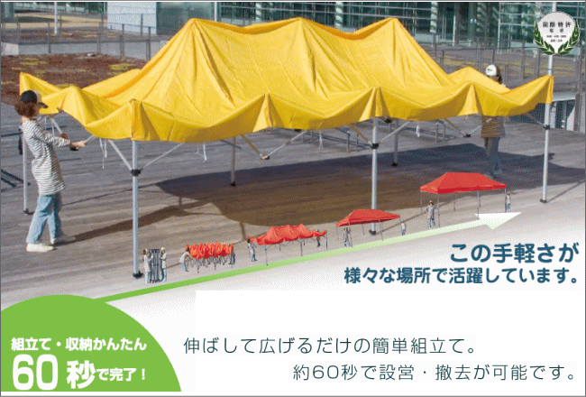 | かんたんてんと®は部品が全て一体化されており「本体を広げるだけで設営」&「閉じるだけで収納」と、 短時間の簡単操作でご使用が可能で、部品紛失の心配もありません。 |