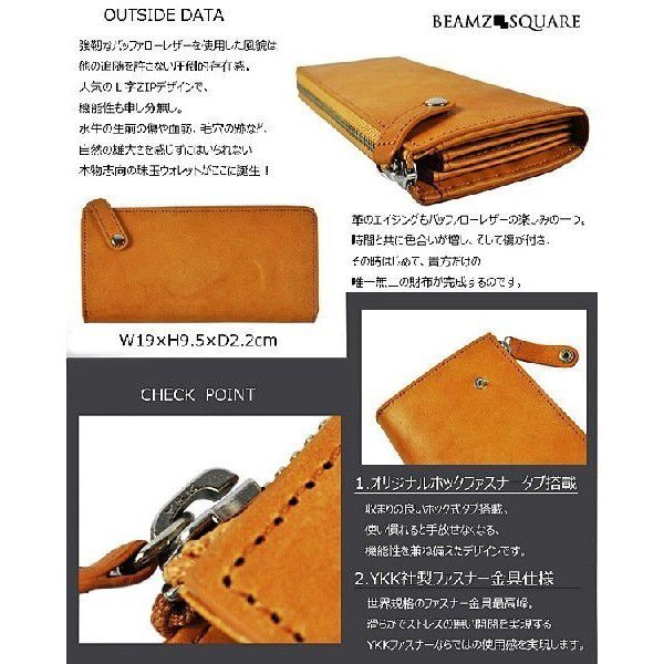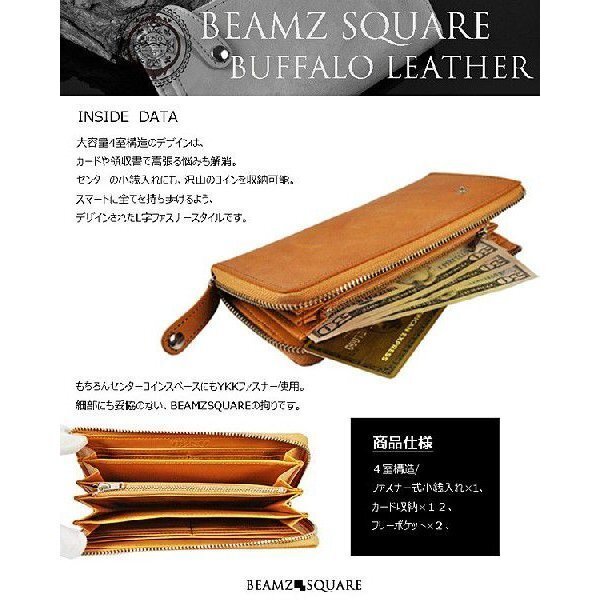■商品名:長財布  メンズ  BEAMZ SQUARE  水牛革  L字ラウンドファスナー 男女兼用 YKK