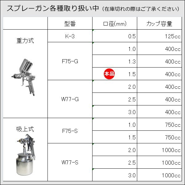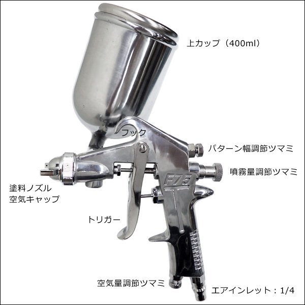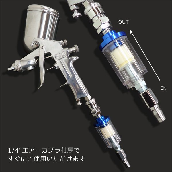 | ■ウォーターセパレータ付き 重力式エアースプレーガン F75-G 1.5mm 400cc■ ■スプレーガン重力式(上カップ)と簡易型ウオーターセパレーターのセットです。 ■家具や車などのDIY塗装に! 【エアースプレーガン】 ■カップの角度は自在に調整可能 ■塗料噴出量やパターン幅調整可能 ■ノズル口径:1.5mm ■使用空気圧:0.3~0.5Mpa ■吹付距離 :15~20cm ■カップ容量:400ml ■エアインレット:1/4" ■付属品:スパナ/掃除ブラシ ■質量(約)本体297g カップ123g 【ウォーターセパレーター】 ■コンプレッサーの圧縮空気から発生するドレン(水滴)を空気と水に分離、 サビなどを防止し、工具の寿命を延長してくれるエアーツールの必需品です。 ■溜まった水は排水ピンを押すだけで簡単に排水できます。 ■1/4"カプラ付属(PF/SM) ■最大空気圧力:0.78MPa ■質量(約)本体+カプラ2個:180g ※本体オスネジ側(IN)→メスネジ側(OUT)に空気が流れるように、エアースプレーガンなどに直接取り付けてご使用ください。 ※取り扱い説明書等はございません。 ※各種部品やご使用方法等につきましては専門店ではございません為、ご質問頂きましてもお答えが出来ません。 ご不明な点は専門業者様にてご相談ください。 ※輸入品につき傷、汚れ、サビなどが有る場合があります。 ※入荷時期により商品や付属部品のデザイン、色など商品仕様の変更がある場合がございます。 その辺をお許しいただける方のみお買い上げください。 その分、大特価で奉仕いたします。 ◎ 他のサイズ・他の種類・ウォーターセパレーター単品もございます。 | ||
