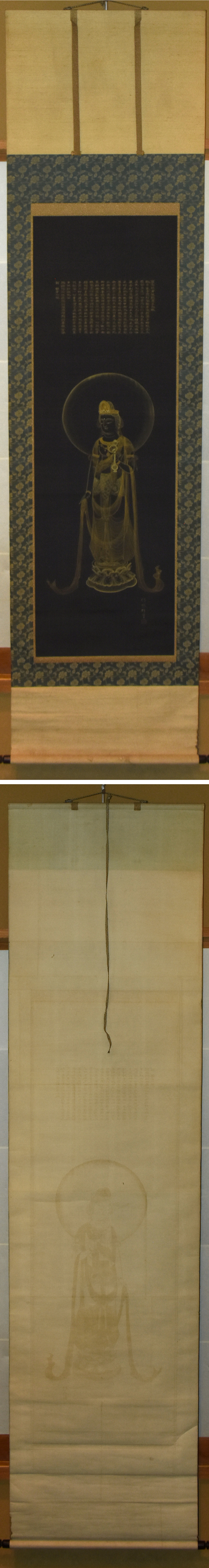 【真作】村上得明「聖観音図 般若心経」絹本 肉筆 掛軸 です。 本品は絹本です。 背面を中心にシミやヤケ、シワはありますが、その他目立ったダメージなくコンディションは良好です。 ※撮影の際に生じた写り込みなどがございます。 ご理解の程よろしくお願い致します。 |