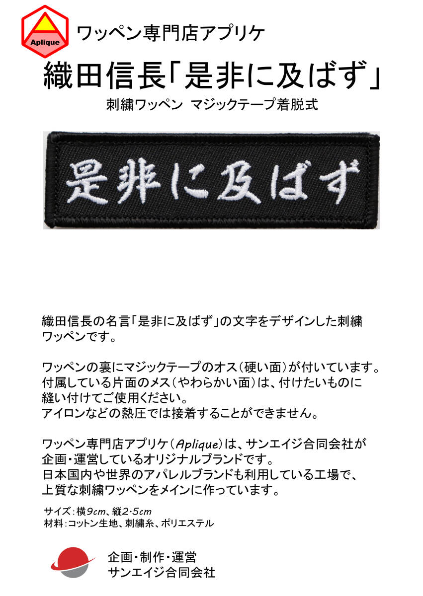 織田信長の名言「是非に及ばず」をデザインした刺繍ワッペンです。