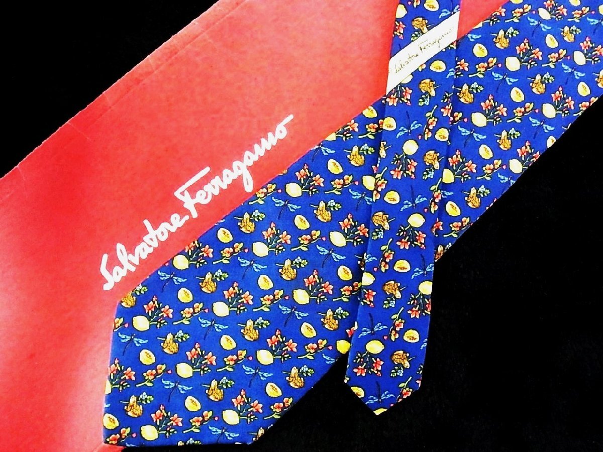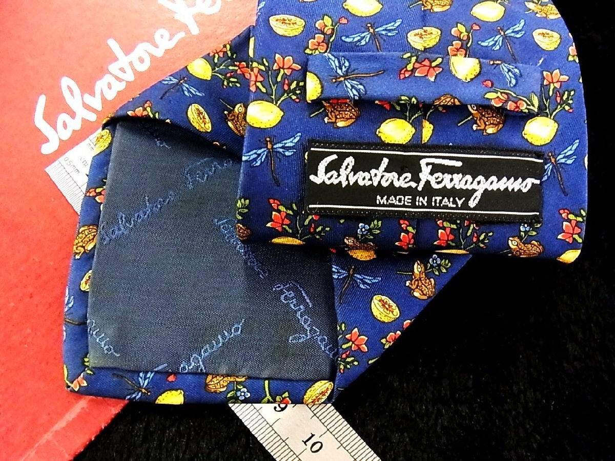 ♪今週の特売980円~♪1739♪状態並品【Ferragamo】フェラガモ【レモン 花 植物 トンボ カエル 柄】ネクタイ♪