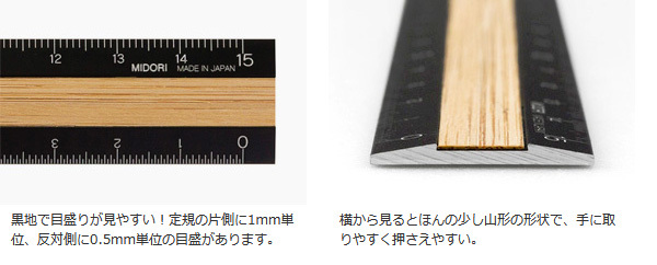 黒地で目盛りが見やすい!定規の片側に1mm単位、反対側に0.5mm単位の目盛があります。横から見るとほんの少し山形の形状で、手に取りやすく押さえやすい。