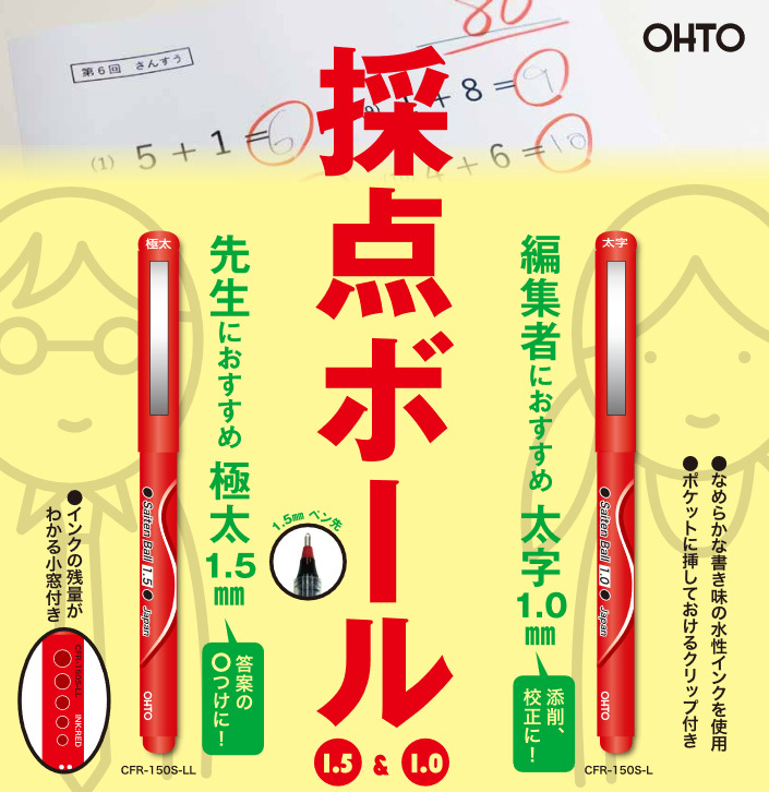 先生におすすめ。なめらかな書き味の水性インクを使用。ポケットに挿しておけるクリップ付き。極太1.5mm。答案の採点をするのに適しています。インクの残量がわかる小窓付き