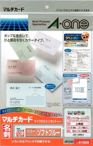 | いろいろなプリンタで印刷できるタイプの名刺用紙です。ミシン目部分を山折り谷折りするだけで名刺サイズに切り離せる、マイクロミシンカットタイプです。【特長】・名刺だけでなく、色分けの必要なカード作成にも使える淡いカラーの用紙です。・厚み:155g/平方メートル(0.18mm)・入数:10シート(100枚) |