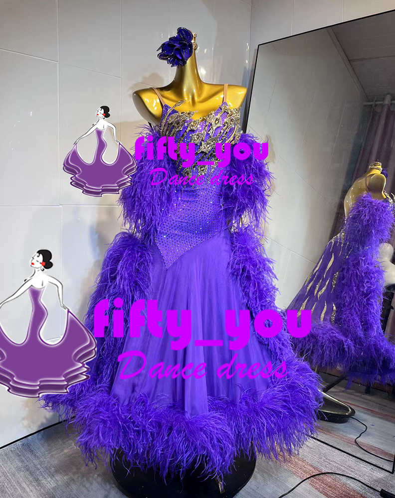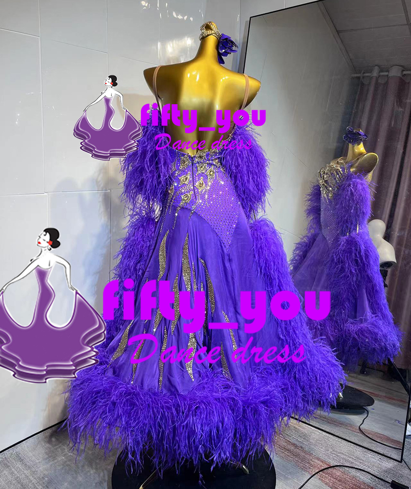 新品fifty_you 魅力サイズセミオーダー ハイクオリティレディース社交ダンス衣装 スタンダードモダンドレス ゴージャスファー付き 紫
