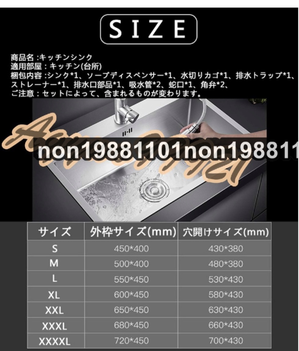●商品未使用 ★状態:新品未使用 サイズ 72*45*20CM 素材 ステンレス鋼 素材構成 ステンレス ?商品名 :キッチンシンク ?適用部屋 : キッチン(台所)、屋外流し台、ガーデンシンク ?シンク材質:304ステンレス ?セット1:シンク*1、排水口部品*1、排水トラップ*1 ?セット2:シンク*1、排水口部品*1、排水トラップ*1、丸蛇口*1、吸水管*2、角弁*2、排水ストレーナー*1、ソープディスペンサー*1、水切りカゴ*1 ?セット3:シンク*1、排水口部品*1、排水トラップ*1、四角い蛇口*1、吸水管*2、角弁*2、排水ストレーナー*1、ソープディスペンサー*1、水切りカゴ*1 ?セット4:シンク*1、排水口部品*1、排水トラップ*1、円形引き出し式蛇口*1、吸水管*2、角弁*2、排水ストレーナー*1、ソープディスペンサー*1、水切りカゴ*1 ?ご注意:セットによって、含まれるものが変わります。セットに含まれている内容は8枚目の図の通りです。 ?私達の流しはあらゆるタイプの台所および浴室のための簡単で流行の流しです。広いシンクと十分なスペースがあり、大家族に最適です。 ?シンク本体は304ステンレス製、錆びず、精密糸引きの技術は品質の金属の質感を現して、油のしみはどこにも落ちていないで、そっと拭くとすぐきれいになります。油をつけないで、水に濡れないで、抗菌、清潔しやすいです。油汚れはやさしく拭き取り、汚れはすぐきれいになります。 ?硬くて耐摩耗性があり、ナイフや釘で摩擦したり、軽く引いたりした後、雑巾を拭くだけで元に戻ります。普通シンクではできないことが多いです。 ?消音パッド付き:厚みのある消音パッドで、下水器の騒音を減らします。凝露防止層、食器棚の湿気を防止し、厚みのある消音パッドで、シンクを使用時はもっと静かです。 ?防臭下水器のデザイン:V型の防臭下水システムは、爬虫類を入れない、大口径は排水が速く、良好な循環を形成しています。外すと清潔も易いS字型のカーブ、 ?シンクで画像通り、ソープディスペンサー、収納棚収納一体の設計は本社が独自に開発した最新のデザインです。まな板や鍋のふたなどを水槽のそばに収納できます、洗剤も付属しているソープディスペンサーに入れることができます。省ペースながらも、高さを利用して、たっぷり容量となっております。