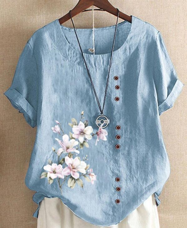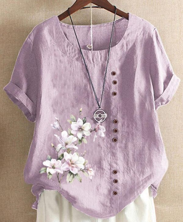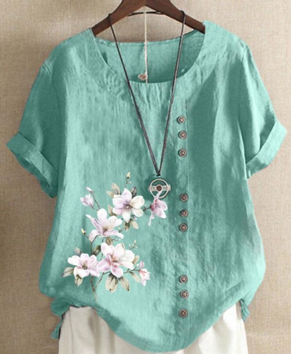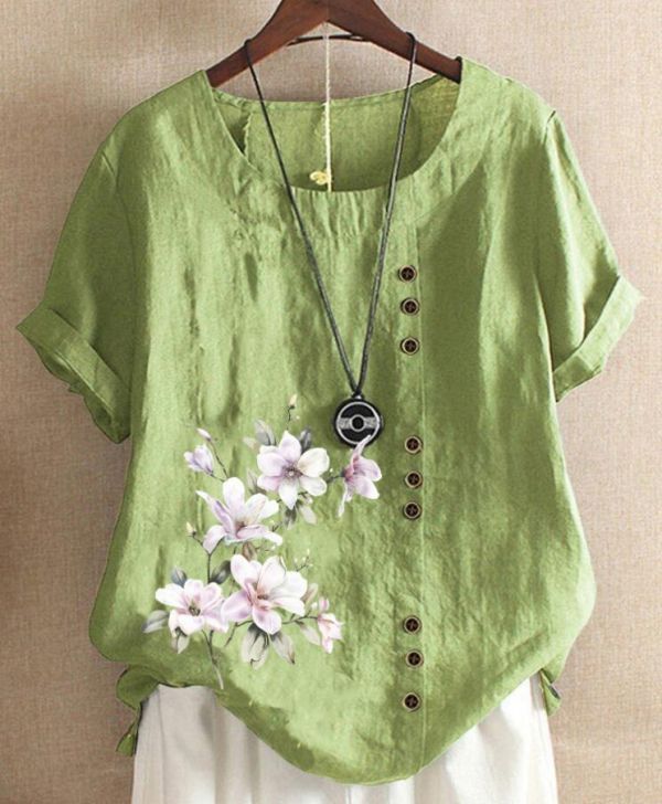 人気推薦 / 夏新作 上品 大人 花柄 ブラウス 大きいサイズ 綿麻 カジュアル きれいめ プリント柄 半袖 トップス チュニック / 緑