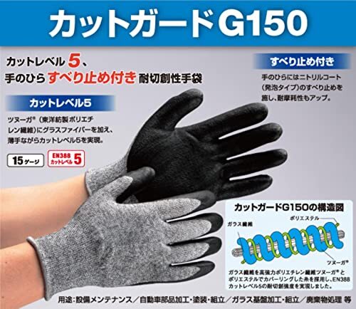 「[ミドリ安全] 耐切創 手袋 作業用 フィット すべりどめ カットガードG150 L 1双入」▼4548890222424▼(商品説明)ノーマル・グレー L G150・・Size:L・[規格] EN388:2016 カットレベルX・B・[素材] 手袋:ポリエチレン(ツヌーガ(R))、ポリエステル、ガラス繊維、ナイロン、その他 すべり止め:ニトリルゴム ●15ゲージシームレス編・[入数] 1双・[リストカラー] S:白、M:緑、L:灰、LL:黄・[注意点] ※回転体に手が巻きこまれるおそれがあるときは、手袋を使用しないでください。 ※ポリエチレン繊維は一般的にアラミド繊維と比較して耐光性、耐薬品性に優れますが、耐熱性は劣ります。ウレタン、または手袋が溶けてやけどをする危険がありますので、高い温度の品物を持つのはお避け下さい。 ※耐切創性手袋は絶対切れない手袋ではありません。又切れにくい素材ですが、扱う製品により条件が異なります。ご使用にあたっては取扱い説明書をよくお読み下さい。 ※EN388カットレベル数値は社内測定データであり、値ではありません。 ※商品のデザイン、仕様、価格等は予告なく変更になる場合がございます。説明 [注意点] ※回転体に手が巻きこまれるおそれがあるときは、手袋を使用しないでください。 ※高強力ポリエチレンは一般的にアラミド繊維と比較して耐光性、耐薬品性に優れますが、耐熱性は劣ります。ウレタン、または手袋が溶けてやけどをする危険がありますので、高い温度の品物を持つのはお避け下さい。 ※耐切創性手袋は絶対切れない手袋ではありません。又切れにくい素材ですが、扱う製品により条件が異なります。ご使用にあたっては取扱い説明書をよくお読み下さい。 ※EN388カットレベル数値は社内測定データであり、値ではありません。 ※カットガード150は切れにくい手袋であり、決して切れない手袋ではありません。必ず使用前に安全をご確認下さい。 ※高強力ポリエチレン繊維は一般的にアラミド繊維と比較して、耐光性、耐薬品性に優れますが、耐熱性は劣ります。繊維が溶けて火傷をする危険がありますので、高い温度の品物を持つのはお避け下さい。