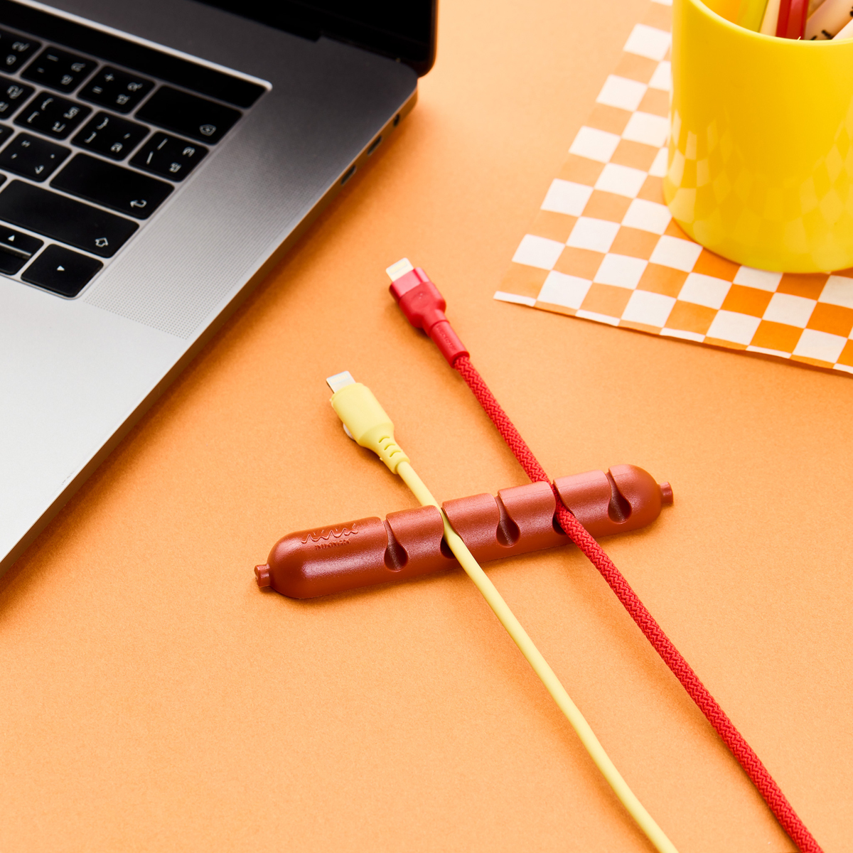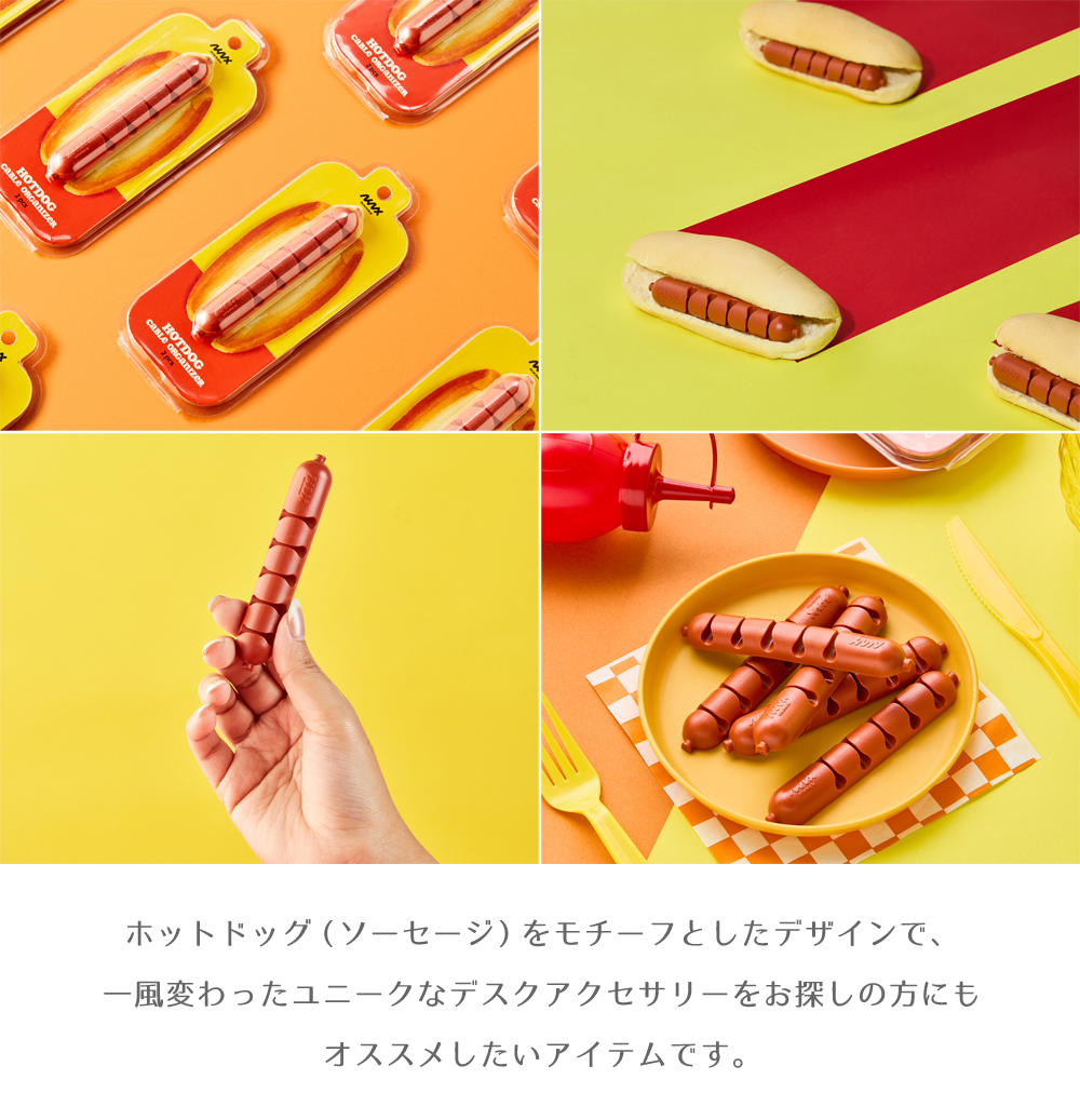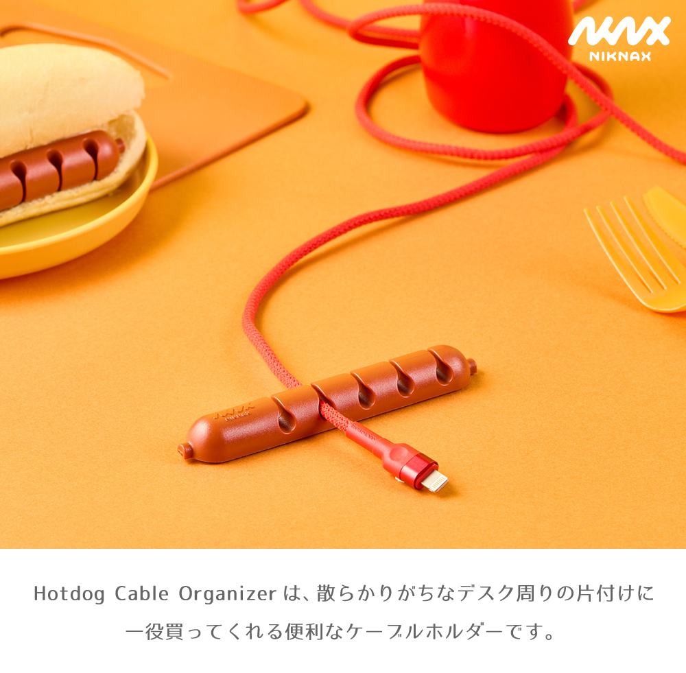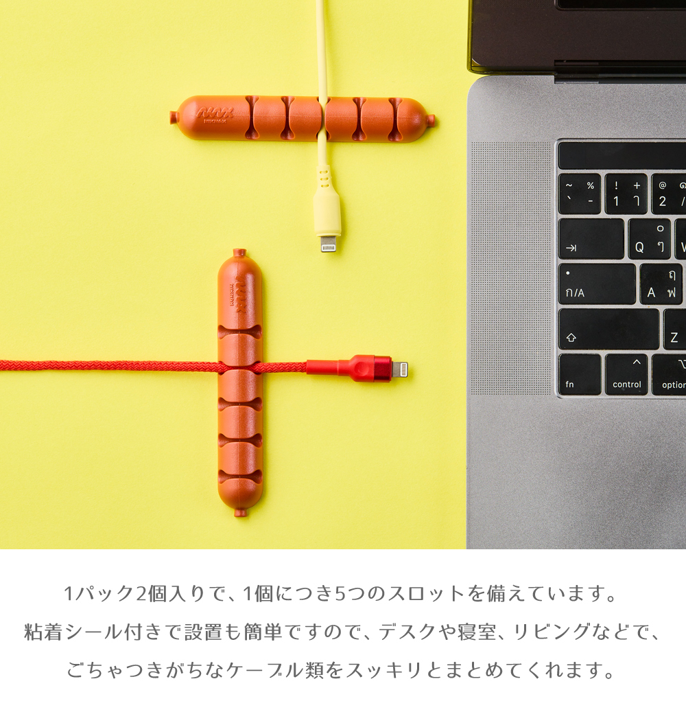 | 商品説明 | "Hotdog Cable Organizer"は、そんなデスク周りなどのケーブルをすっきりと整理できる、使い勝手抜群のケーブルホルダーです。 1パック2個入りで、1個につき5つのスロットを備えており、粘着シール付きで設置も簡単ですので、デスクや寝室、リビングなどで、ごちゃつきがちなケーブル類をスッキリとまとめてくれます。 ホットドッグ(ソーセージ)をモチーフとしたデザインで、一風変わったユニークなデスクアクセサリーをお探しの方にもオススメのアイテムです。 |