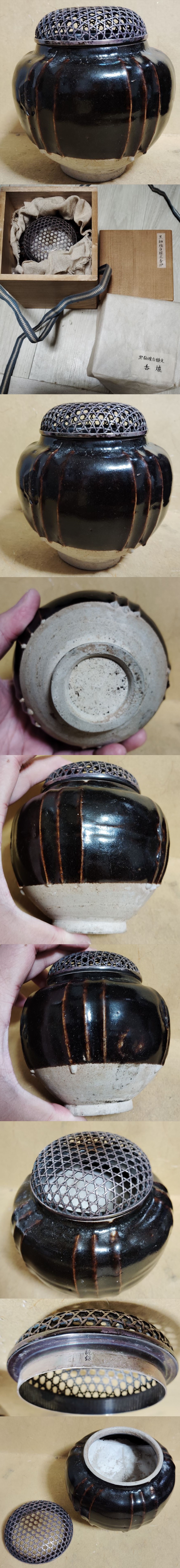 時代保証 中国古玩 宋代 磁州窯 黒釉 条形 香炉 鉄絵 純銀蓋 梅瓶 壺 / 陶器 陶芸 古美術