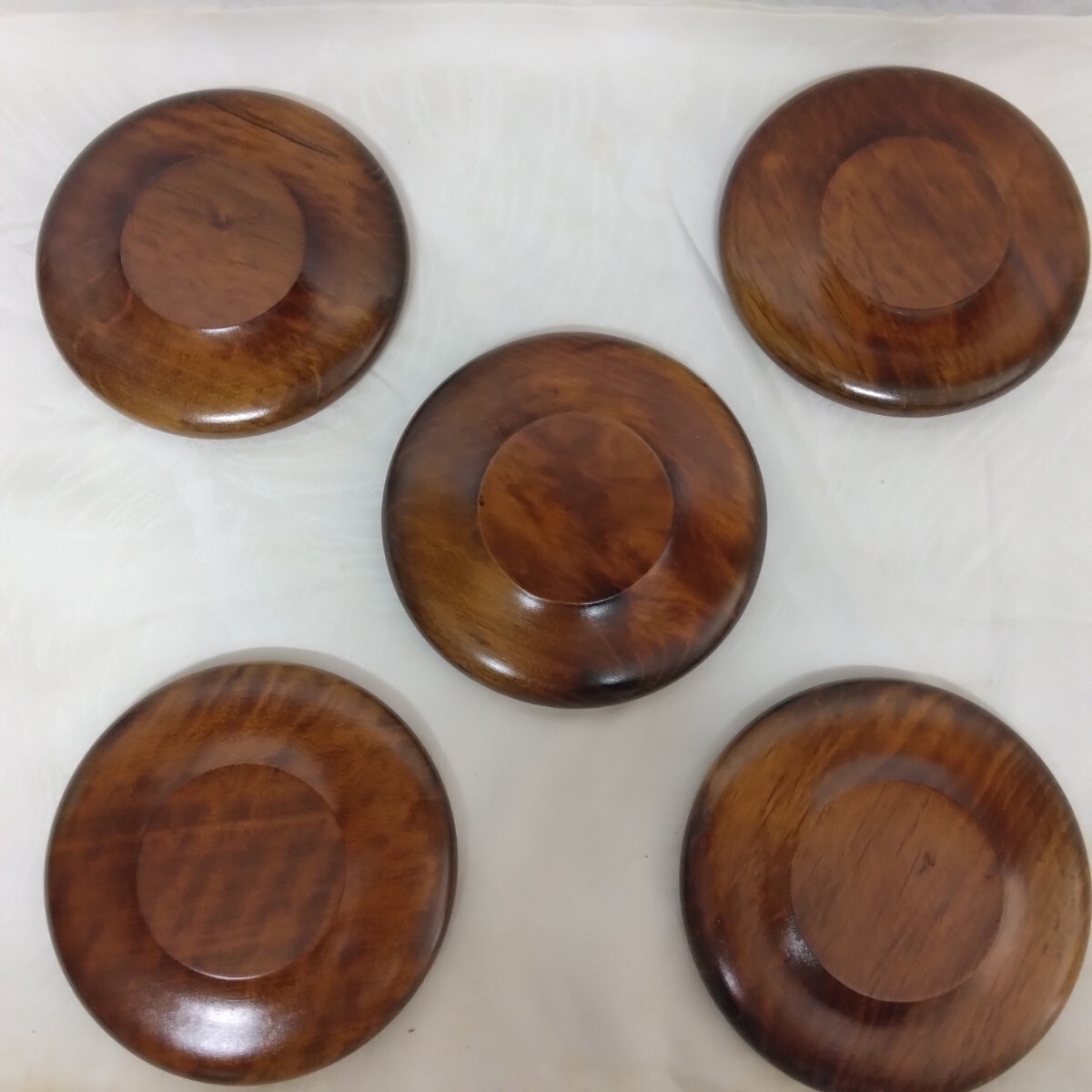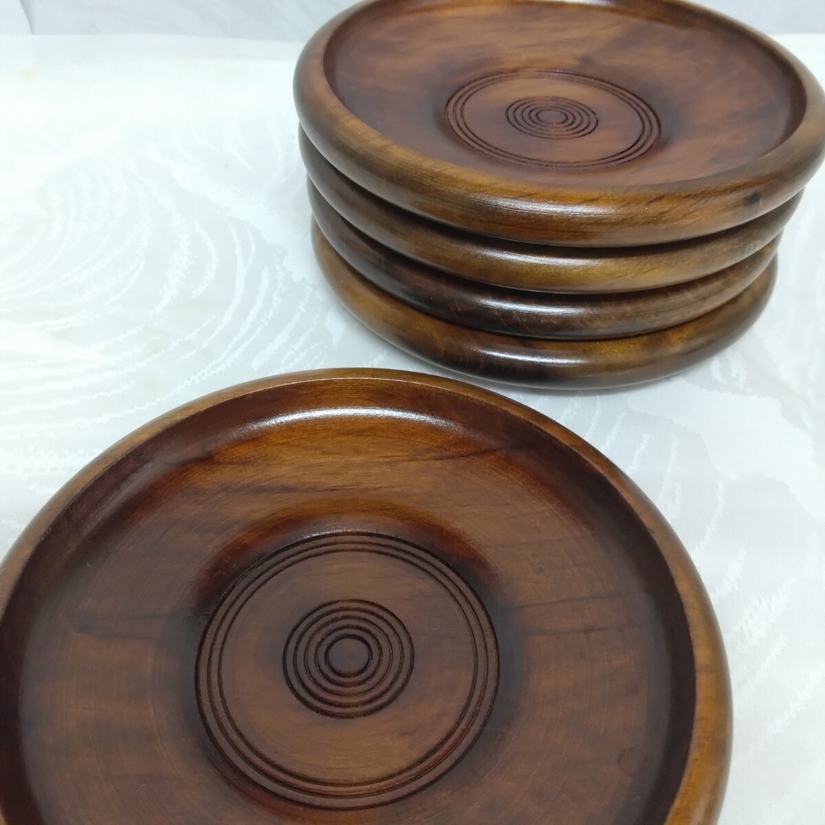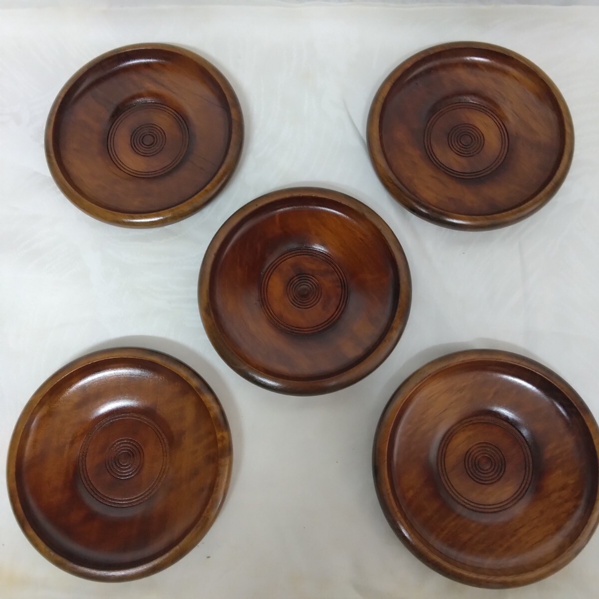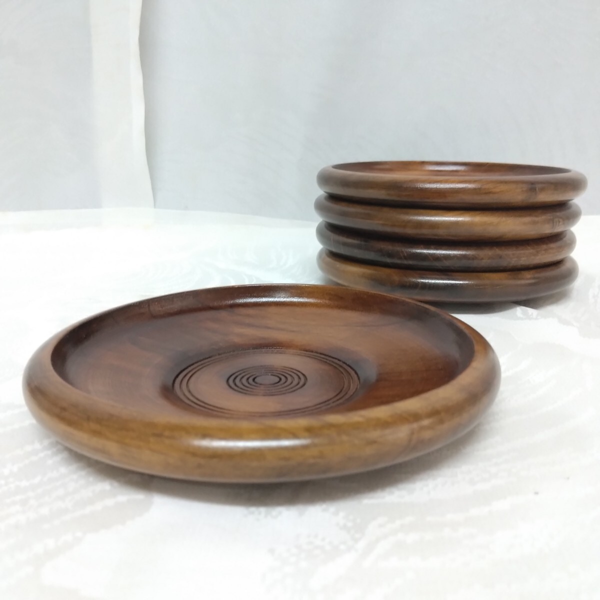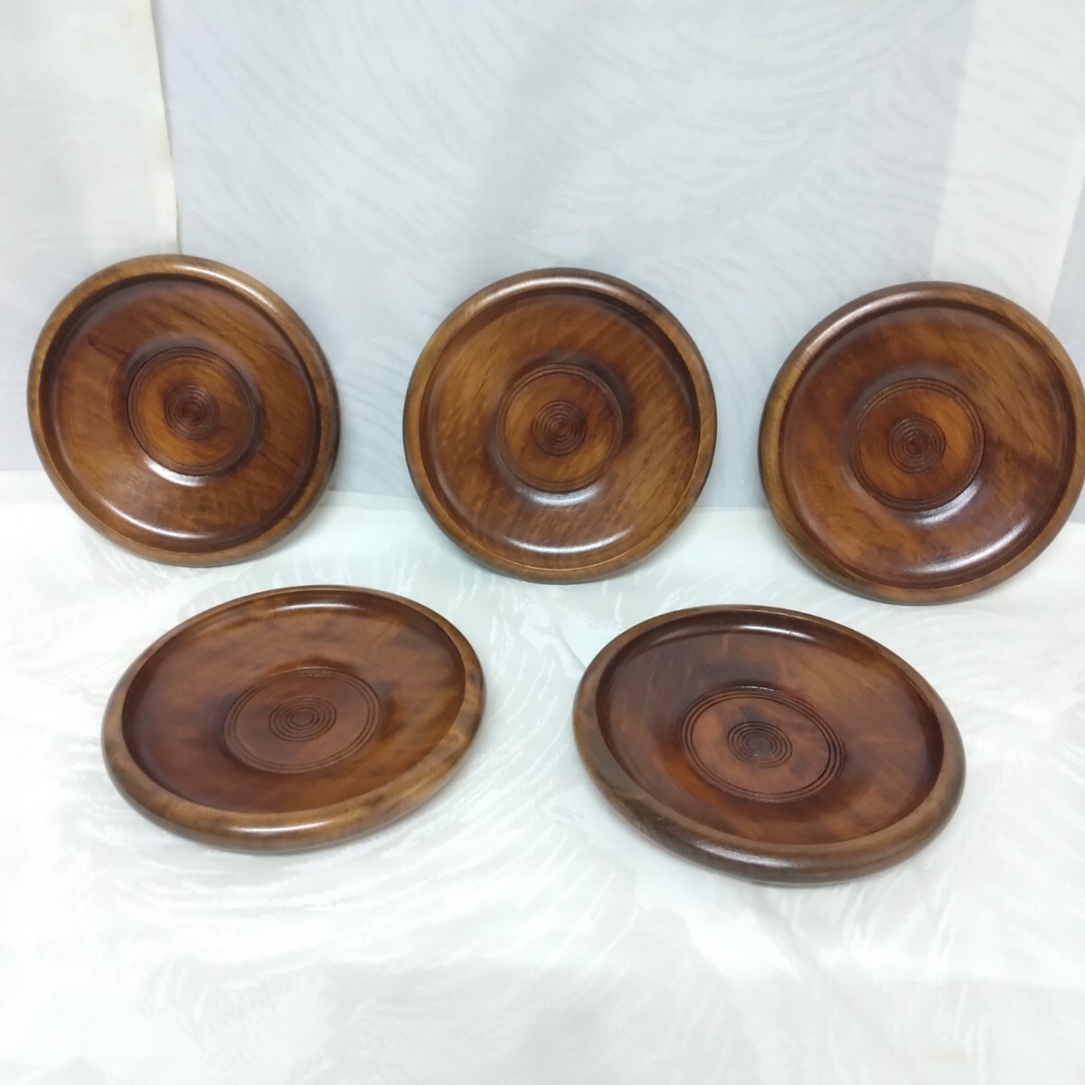 美品【 茶托 コースター 】木製 丸型 5枚 セット 蛇の目模様 天然木 茶道具 和風 接待 接客