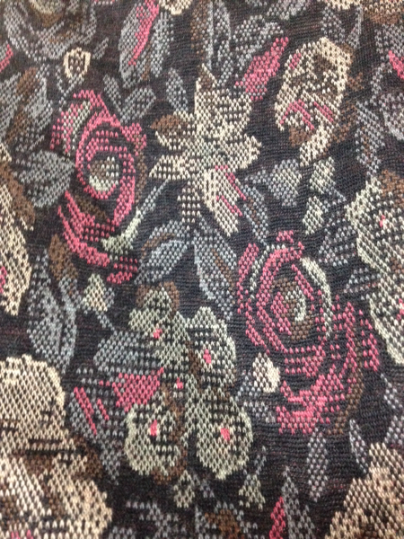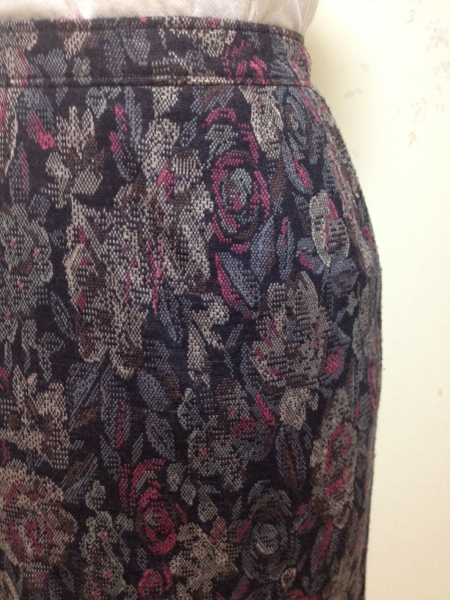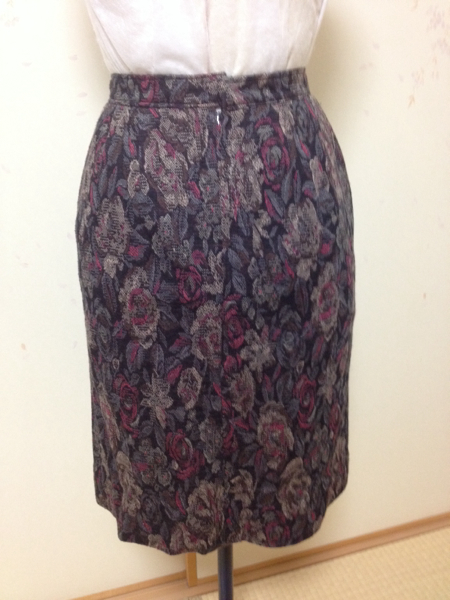 黒地にチェリーピンクとベージュのバラ、グレーの葉がシックなニット地のスカートです。