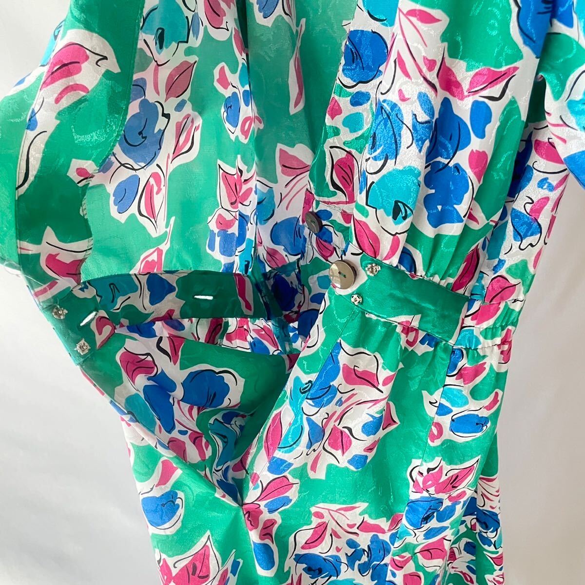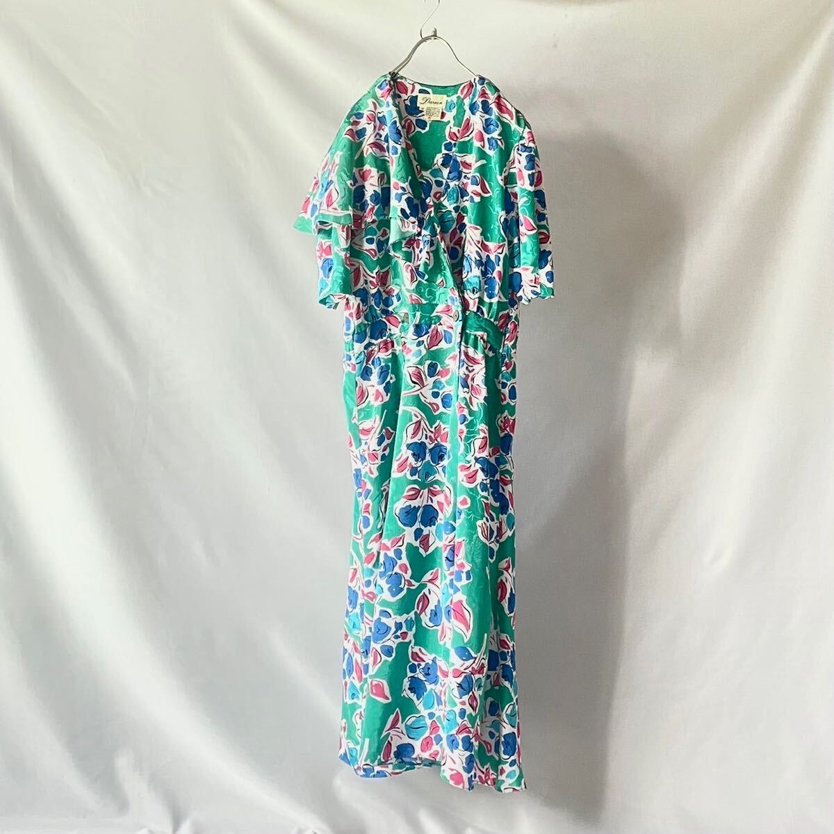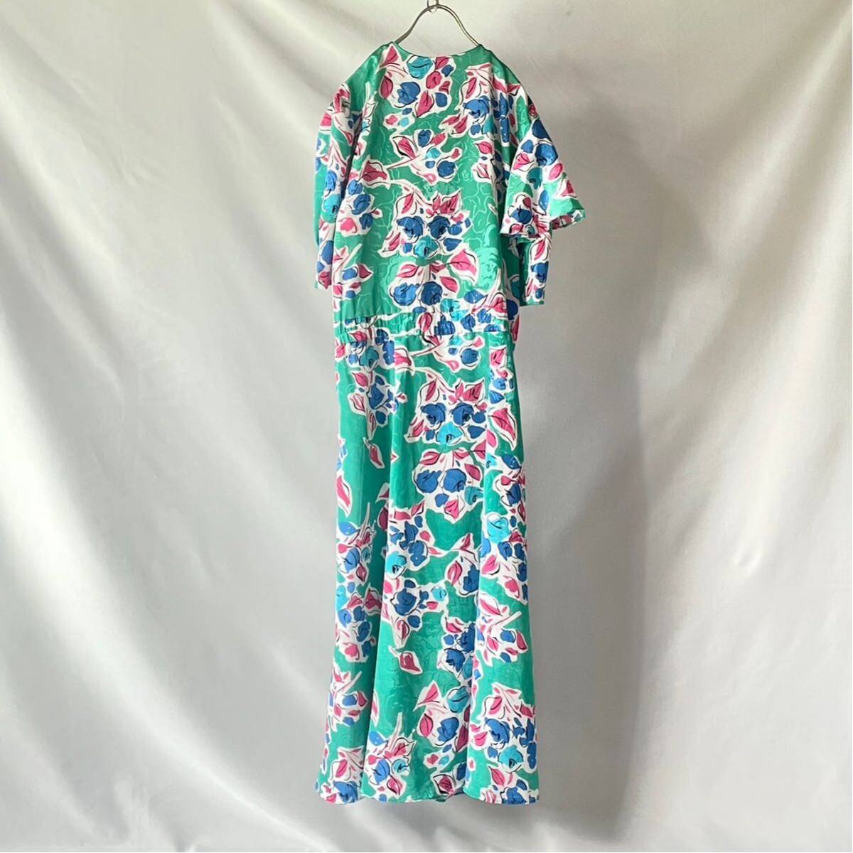 80年代頃のグリーンにピンク、ブルーの花柄が可愛いポリエステルワンピースです。
