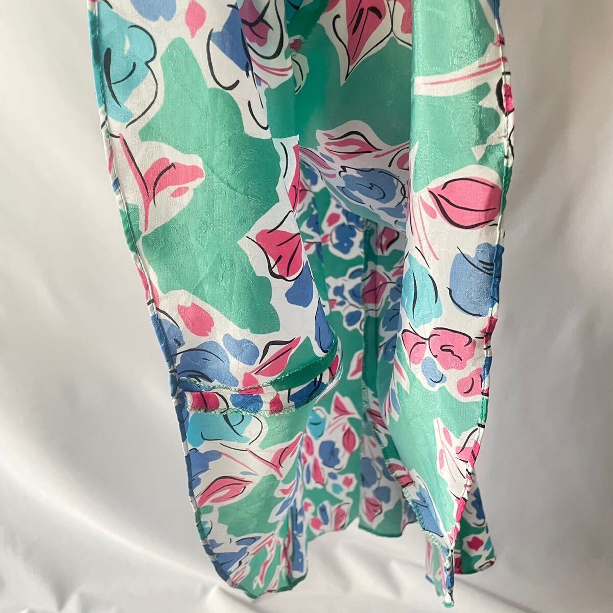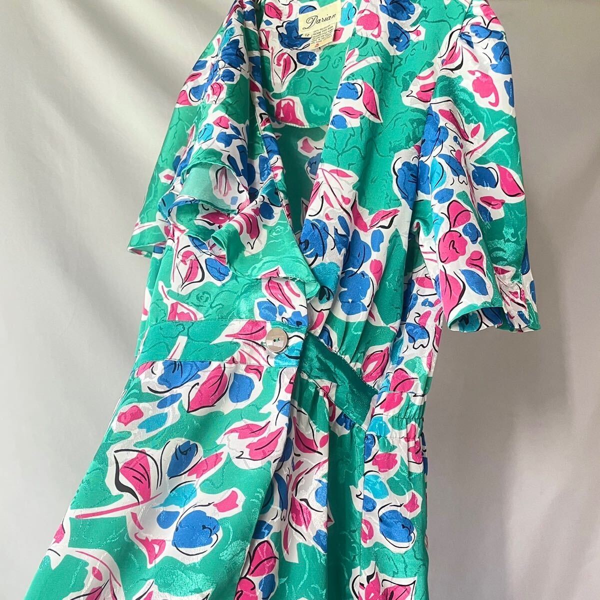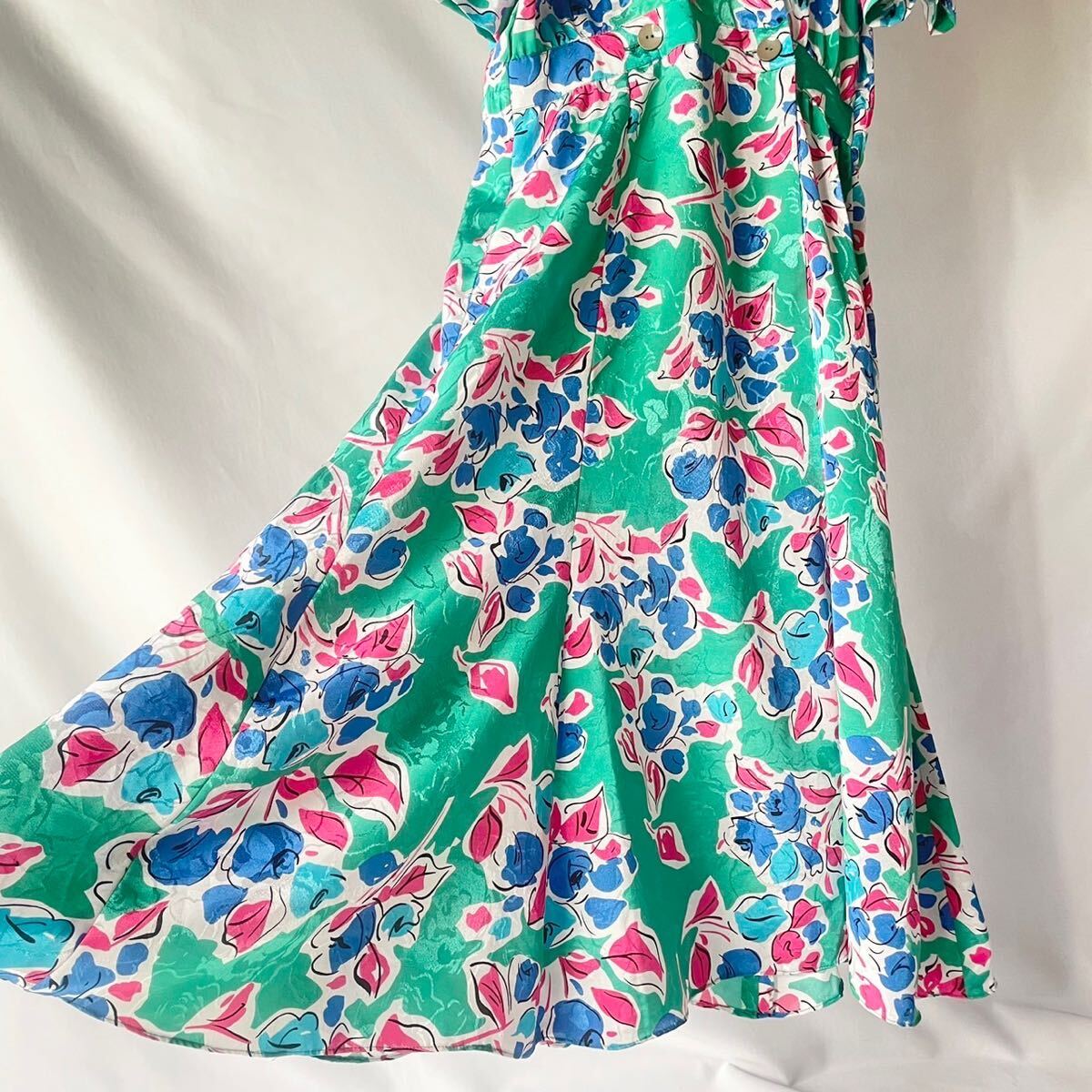 80年代頃のグリーンにピンク、ブルーの花柄が可愛いポリエステルワンピースです。