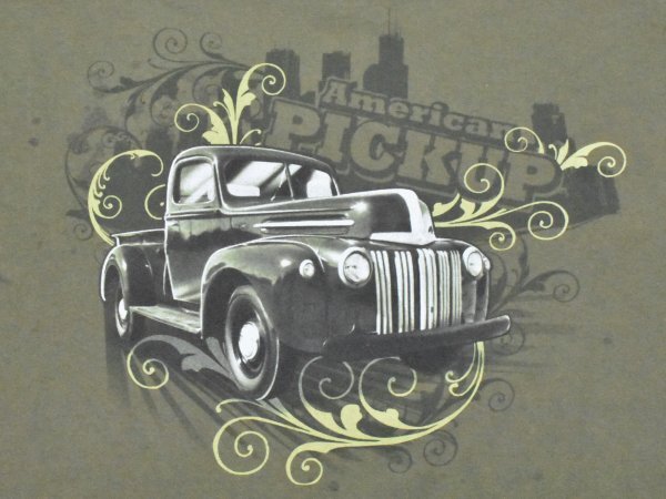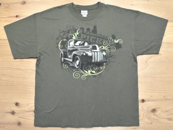 ボディのカラーは落ち着いたモスグリーンのような色で、大きくアメ車がプリントされています。